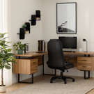 Ce bureau d'ordinateur économise de l'espace lorsqu'il est utilisé dans un coin, mais il est fini de tous les côtés pour un look soigné peu importe où il est placé dans un bureau à domicile.
