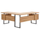 Le dessus de bureau flottant en forme de L est généreusement dimensionné et laisse de l'espace pour utiliser le dessus des blocs-tiroirs comme tablettes.