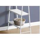 Les pieds de style chevalet en métal blanc sont utilisés comme supports pour 4 tablettes ouvertes qui peuvent être utilisées pour afficher des livres, de petites boîtes de rangement ou d'autres articles.