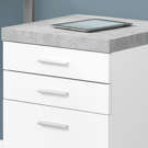Complétez votre endroit de travail avec ce classeur mobile compact et fonctionnel dans un superbe fini blanc avec un look cimenté sur le dessus. Il peut être placé n'importe où grâce à 5 roulettes (2 verrouillables) pour compléter votre collection avec des bureaux identiques (vendus séparément). Également utile en tant que support d’imprimante, ce classeur est là pour vous aider à compléter vos travaux, quel que soit la tâche à accomplir.