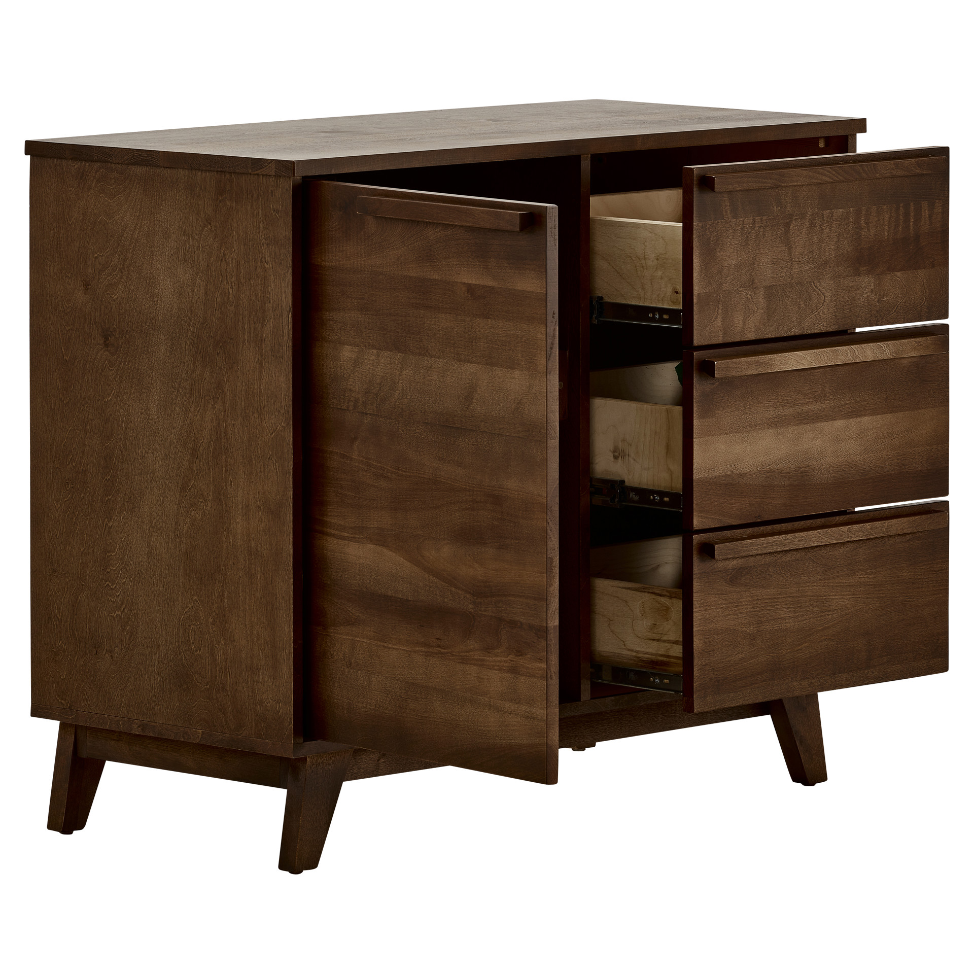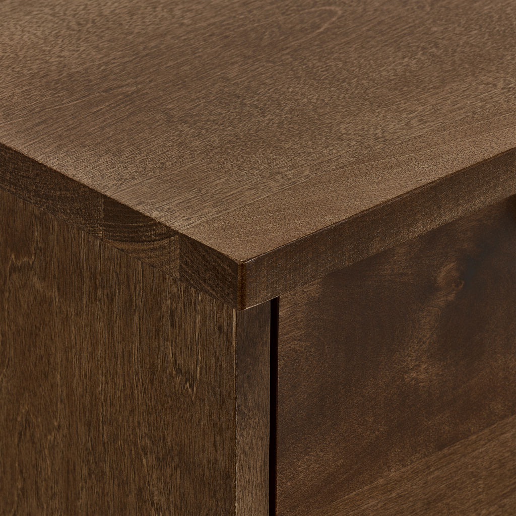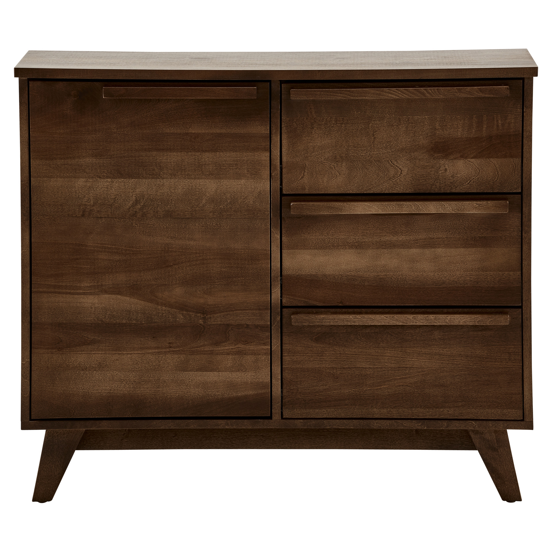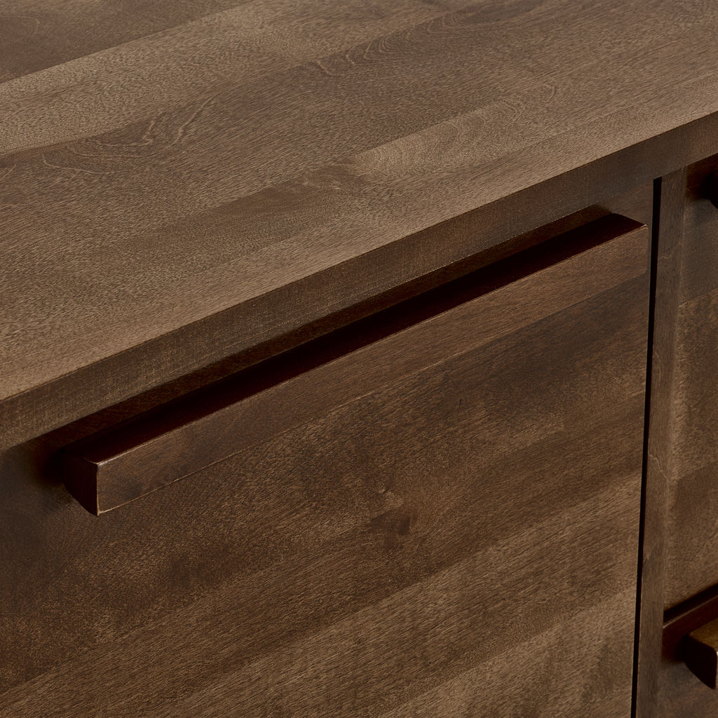 Les poignées intégrées créent des lignes épurées tandis que les pieds inclinés ajoutent une touche de modernité. La surface généreuse du plateau vous permet d'exposer vos plus beaux objets ou de créer un espace de service pratique.