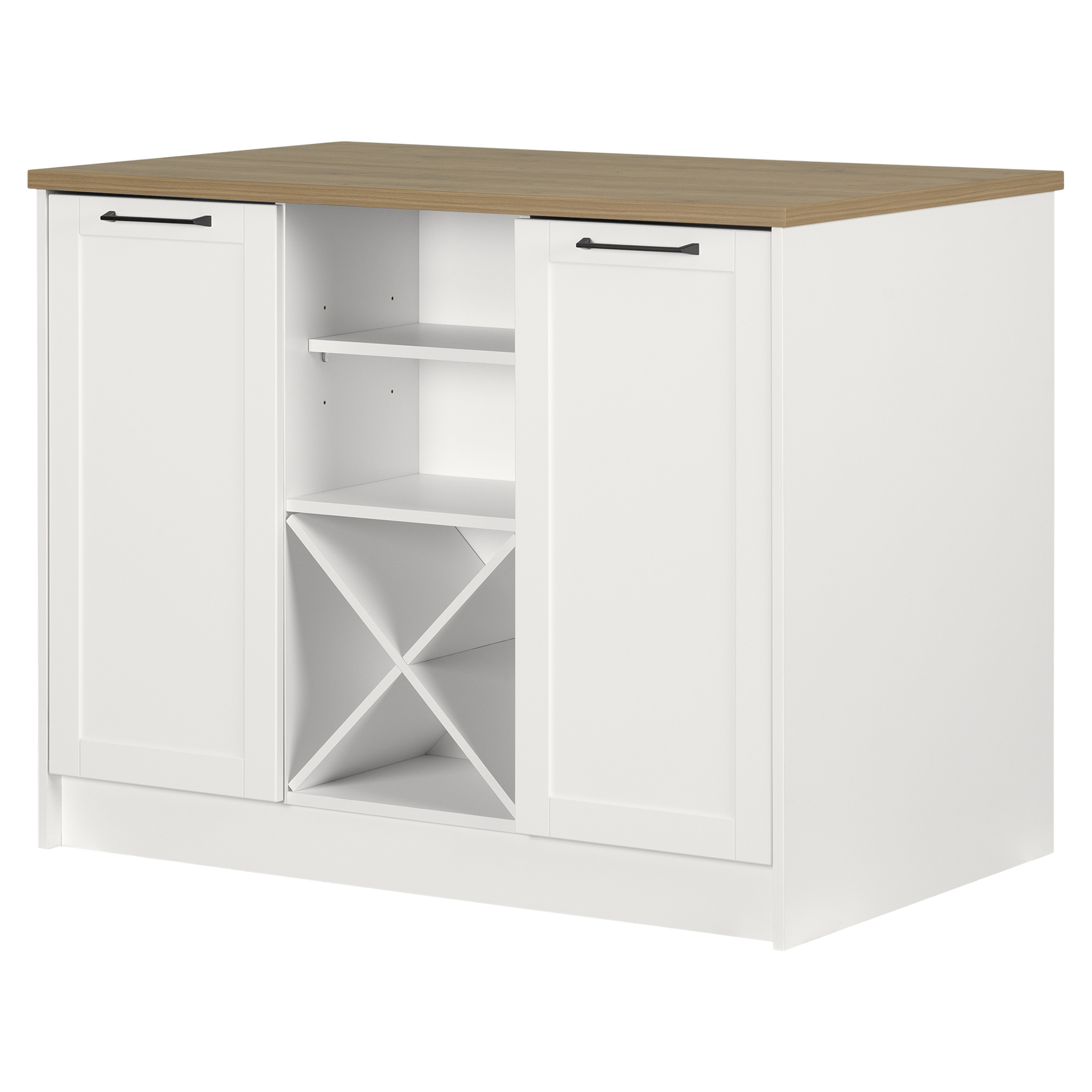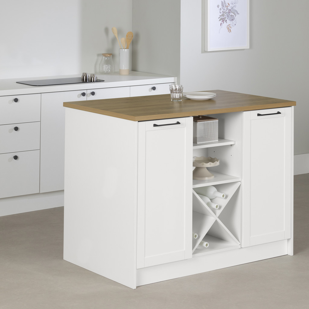UNE TONNE DE RANGEMENT : ajoutez du rangement facilement dans votre cuisine à l´aide de cet îlot. En plus d´être doté d´un rangement à vin intégré (parfait pour recevoir!), de 2 armoires avec tablettes fixes et de 2 compartiments ouverts, il peut être installé tant de côté, contre un mur, qu´au centre de la pièce.
