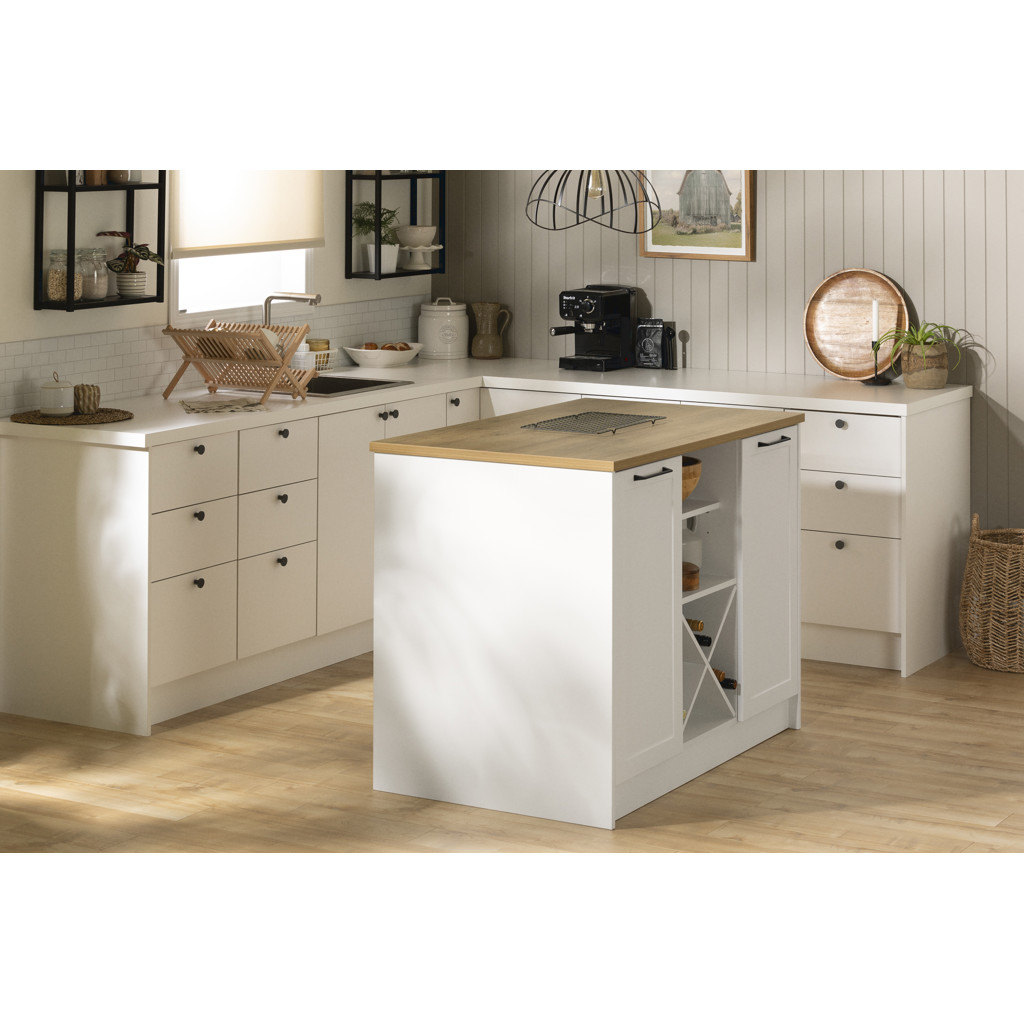 Cet îlot de cuisine au cachet authentique dispose de délicates poignées en métal et d´élégantes portes cadrées. Grâce à son apparence polyvalente, il s´intègre bien à plusieurs styles de cuisine, et ce, sans grande rénovation de votre part! Son design bien pensé s'étend jusqu´à son plan de travail en mélamine, qui offre un vaste espace pour la préparation des repas, la prise du petit-déjeuner et la réception des invités. Sa surface est hydrofuge, résistante aux égratignures et facile à laver. De quoi faciliter grandement la gestion des dégâts et l´entretien quotidien!