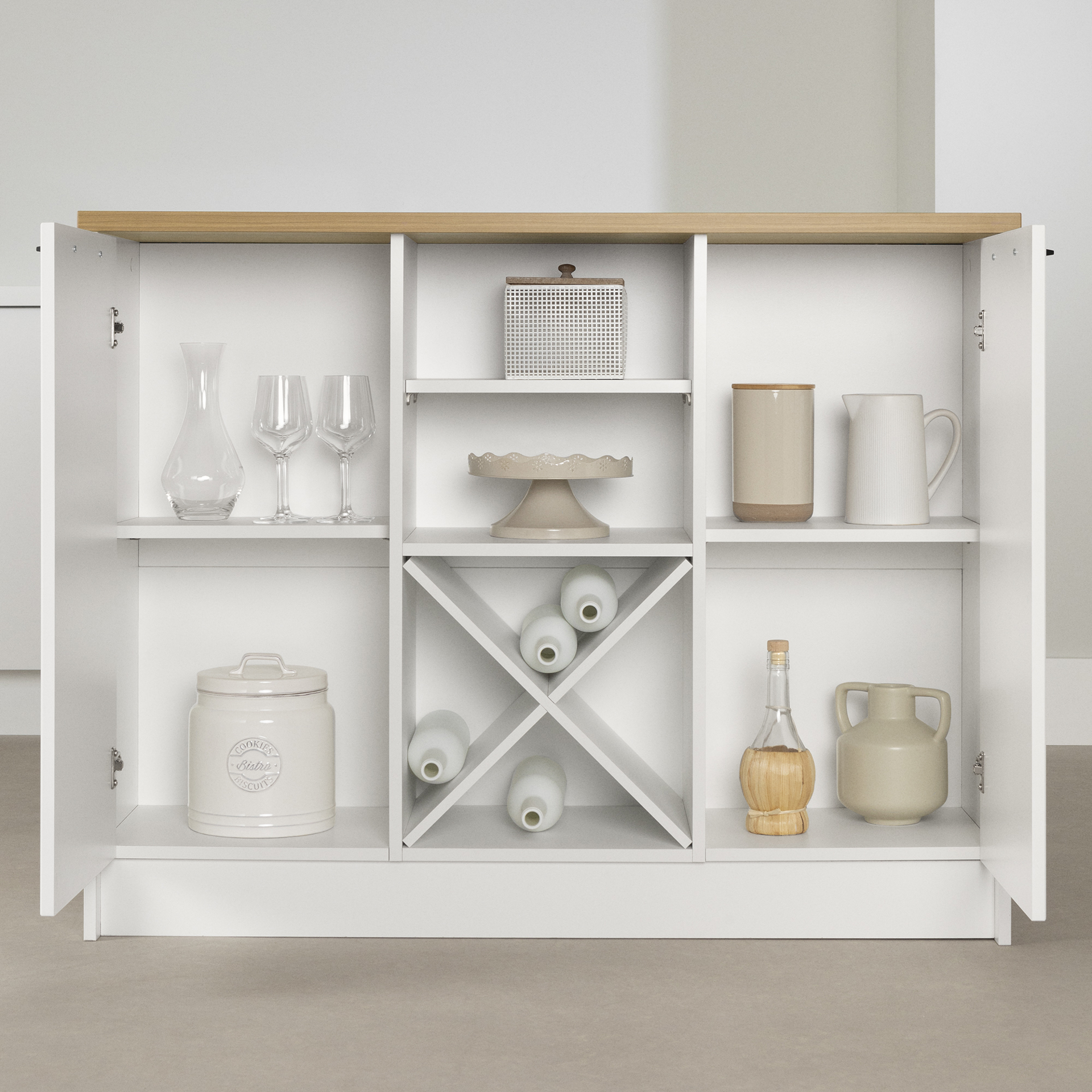 Les 2 tablettes ajustables derrière les portes et les 2 tablettes fixes au-dessus du rangement à vin amovible sont idéales pour accueillir vos livres de cuisine et autres décorations.