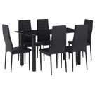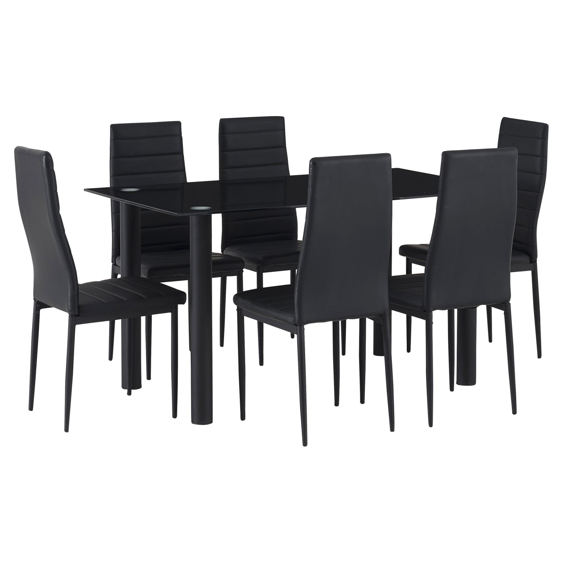 Cet ensemble de salle à manger allie élégance et praticité pour transformer votre espace repas. Le plateau en verre noir apporte une touche moderne et sophistiquée, tout en étant facile d'entretien au quotidien. Les six chaises rembourrées offrent un confort optimal avec leur dossier haut et leur revêtement résistant.