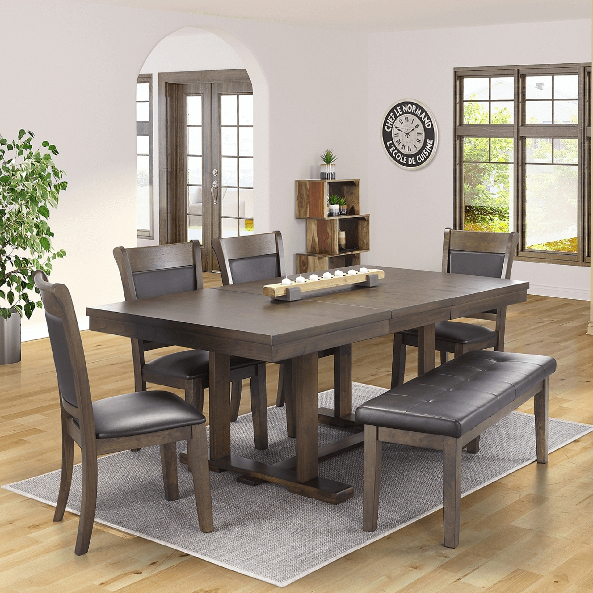 Cet ensemble est conçu pour les familles qui recherchent à la fois durabilité et confort au quotidien. Le plateau de la table se glisse facilement pour les repas intimes ou les grandes occasions. Le bois travaillé confère chaleur et caractère à votre intérieur, tandis que le cuir synthétique des sièges facilite l'entretien.