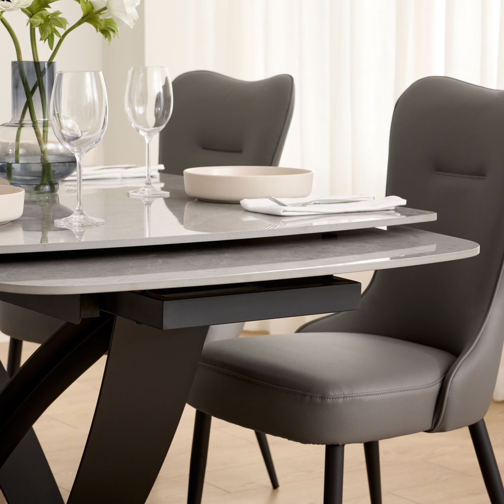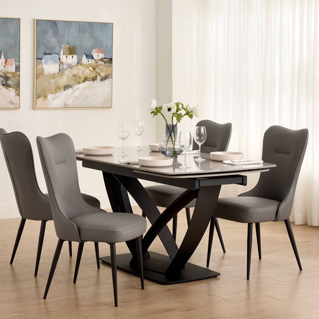 Table à manger extensible de la collection Tammy avec plateau en céramique laquée au fini marbre gris, offrant une surface à la fois élégante et résistante. Dotée de deux rallonges intégrées, elle atteint une longueur maximale de 100 pouces. Sa base sculpturale en métal noir assure stabilité et caractère, s’intégrant parfaitement à un intérieur contemporain ou sophistiqué.