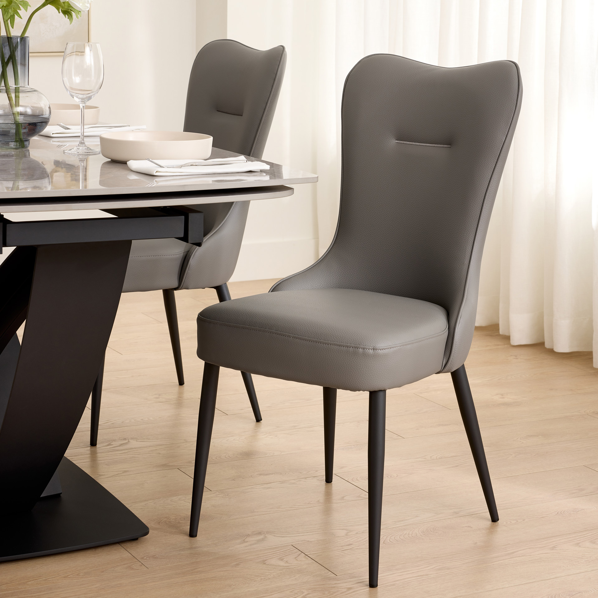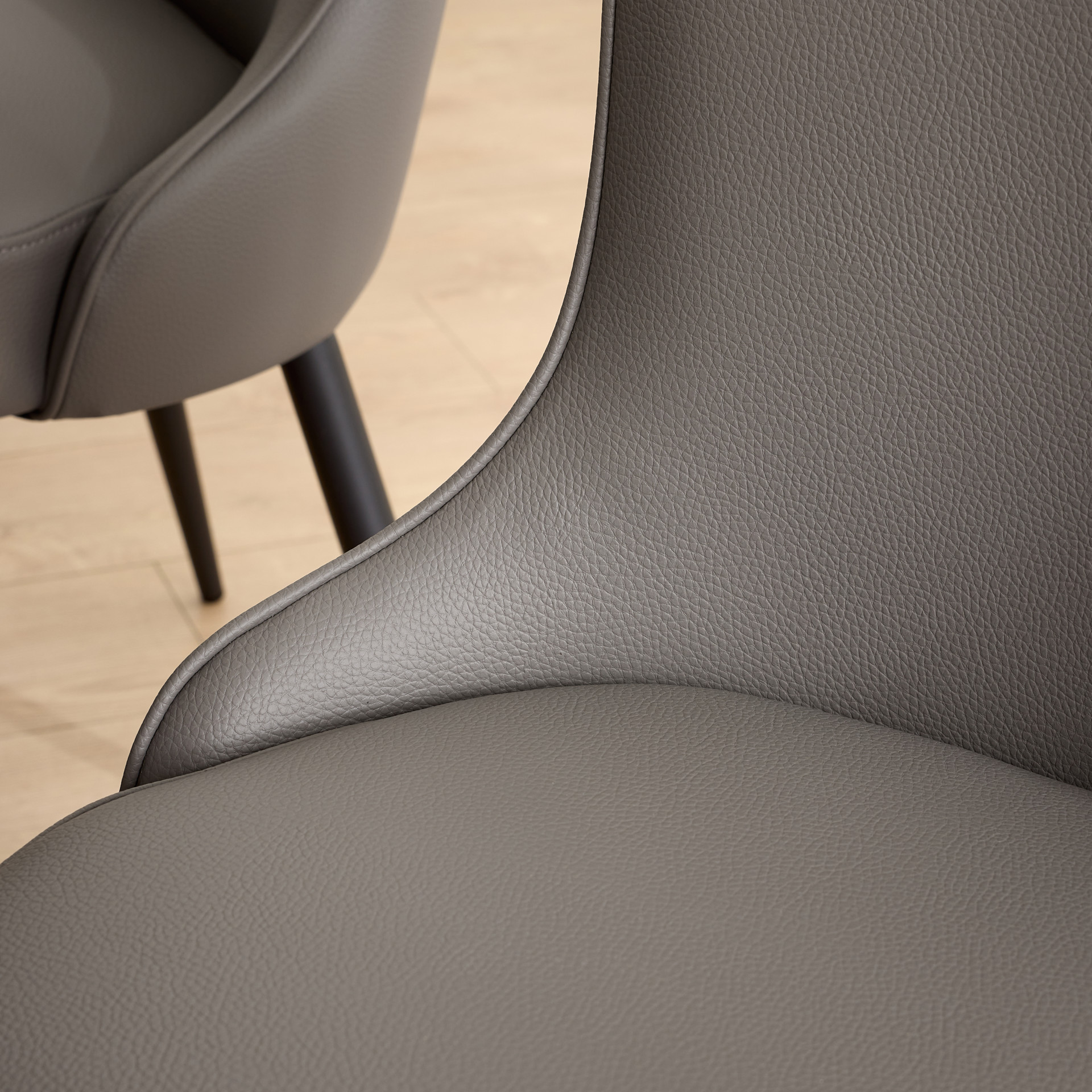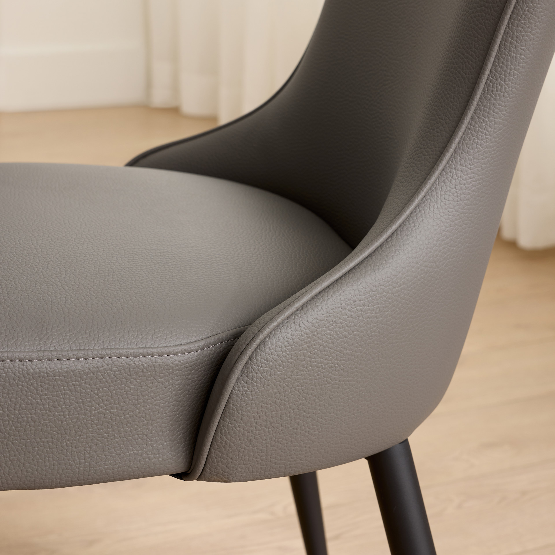 La chaise de salle à manger Tammy est revêtue d'un cuir synthétique gris taupe au grain fin. Son dossier incurvé et rembourré offre un bon soutien, tandis que ses pieds fuselés en métal noir assurent stabilité et élégance. La silhouette moderne s’intègre aisément dans des décors contemporains ou épurés.