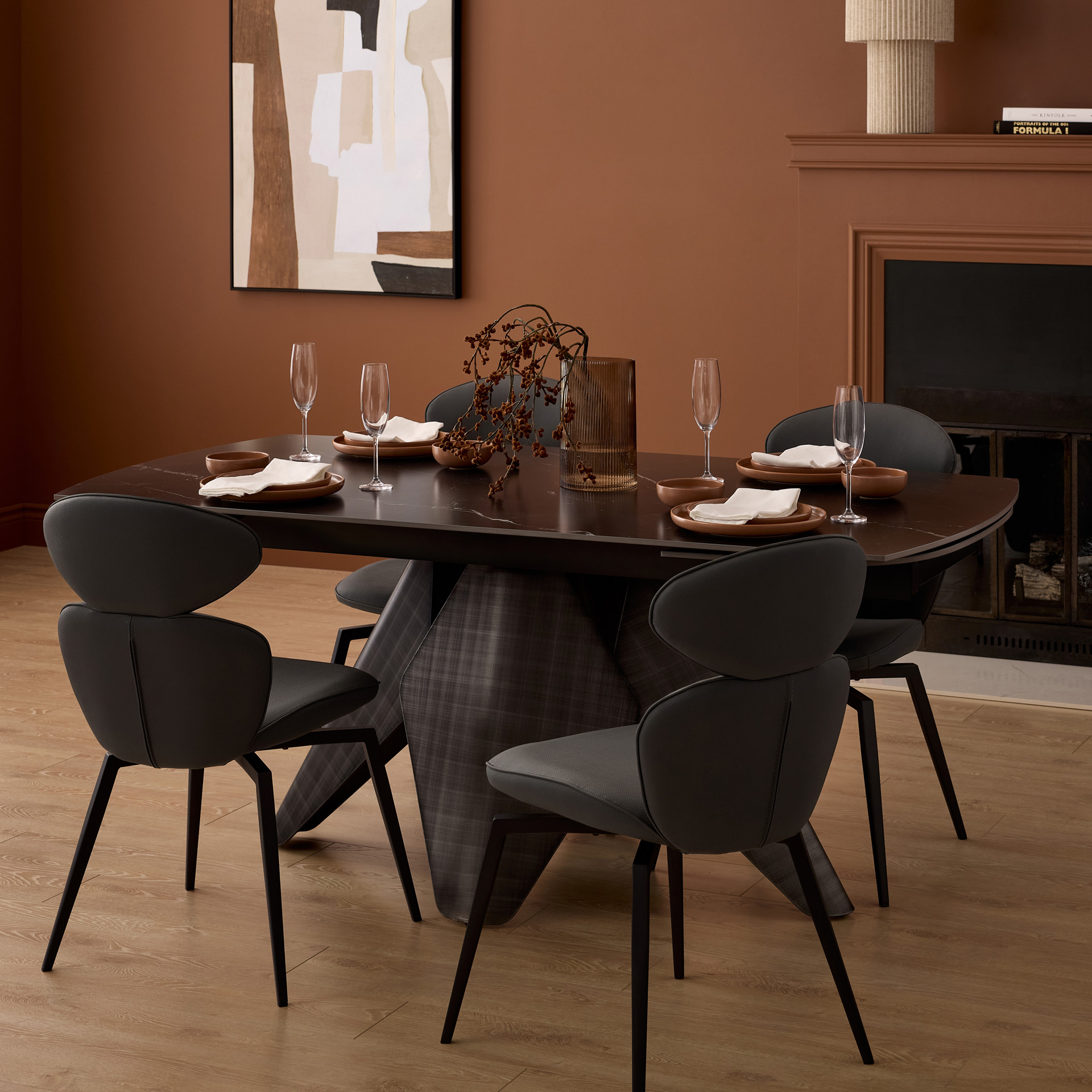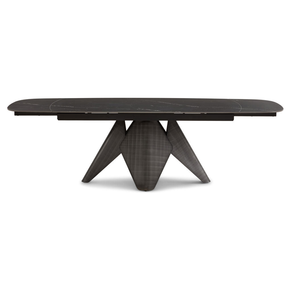 Le plateau en pierre frittée noire, la base métallique et les chaises en polyuréthane se marient avec élégance pour créer un espace à la fois convivial et raffiné.