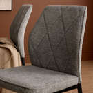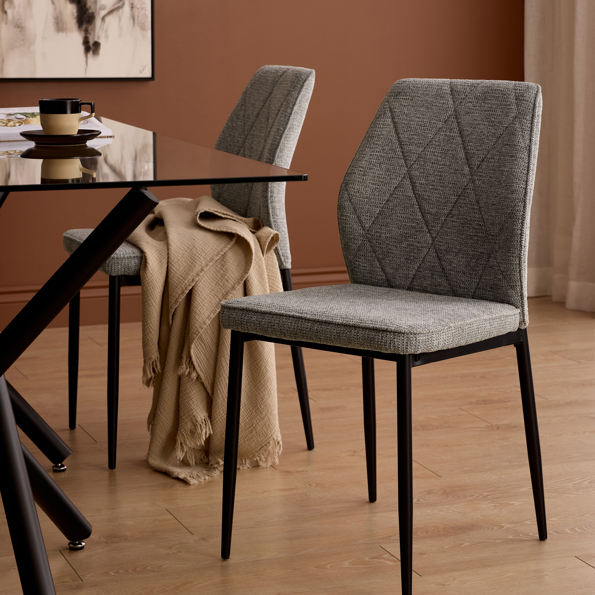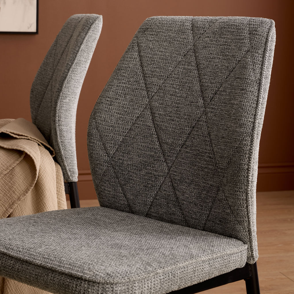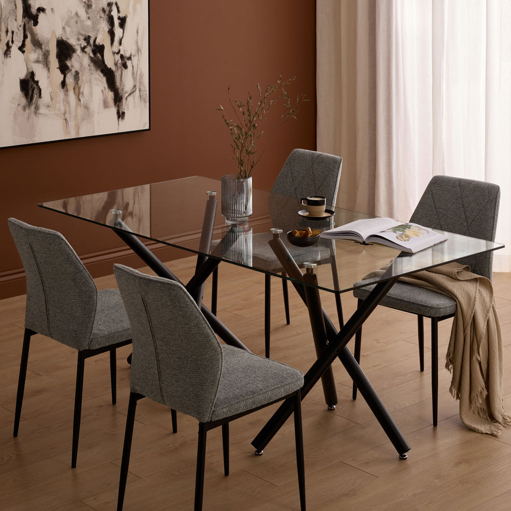 Les chaises, au revêtement doux et texturé, s’harmonisent parfaitement avec la table au design croisé distinctif, pour un effet visuel léger mais structuré.