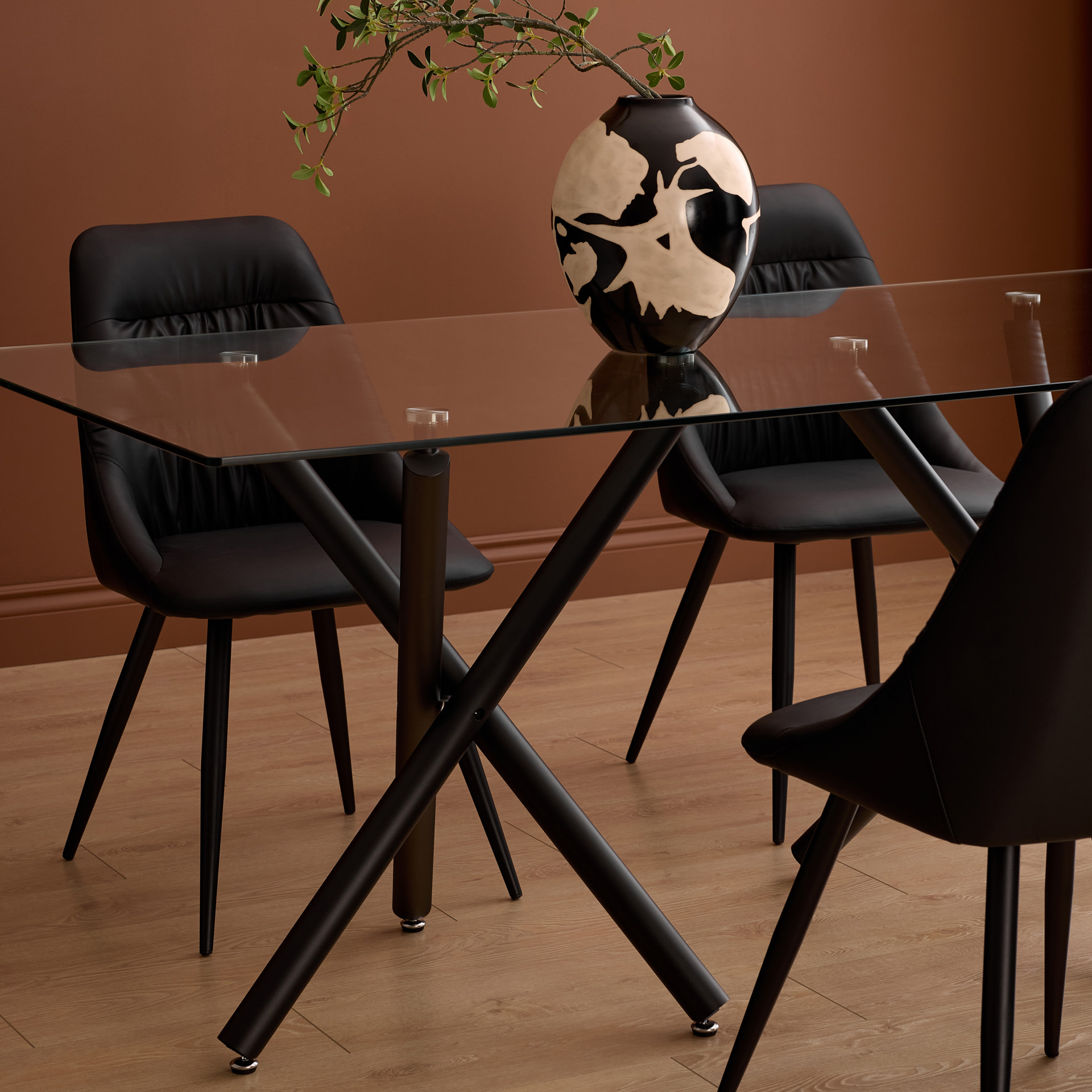 Les chaises, au revêtement texturé, s’harmonisent parfaitement avec la table au design croisé distinctif, pour un effet visuel léger mais structuré.