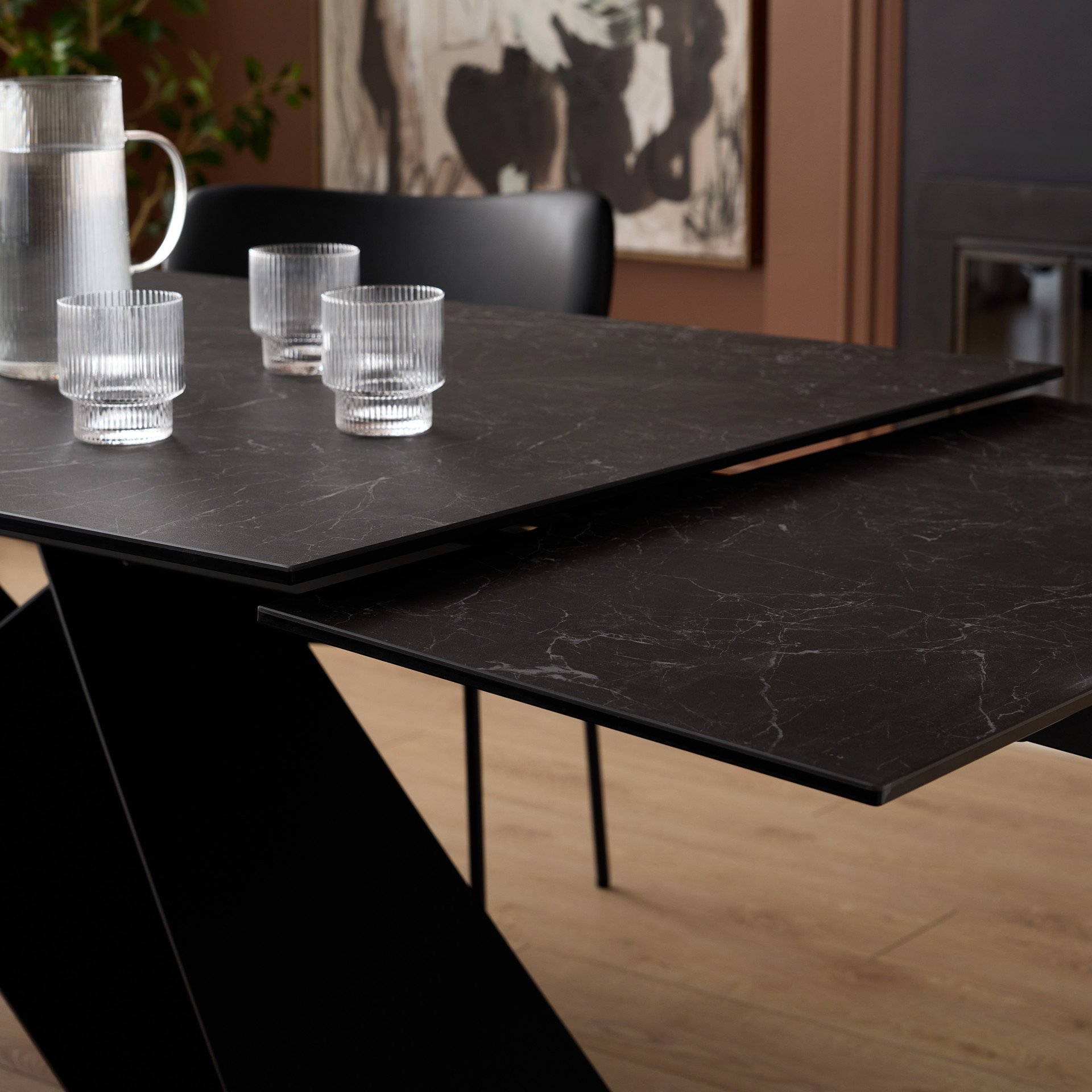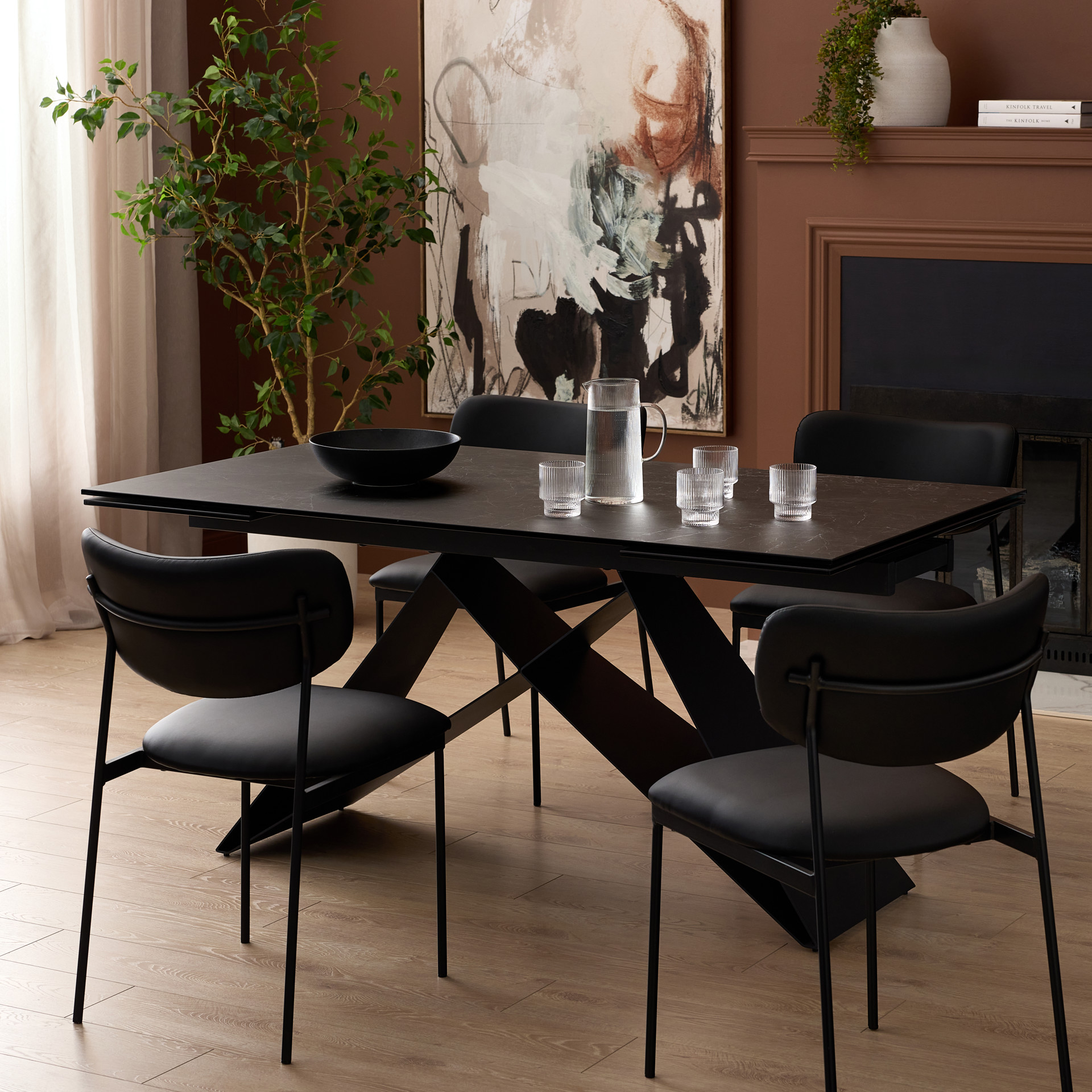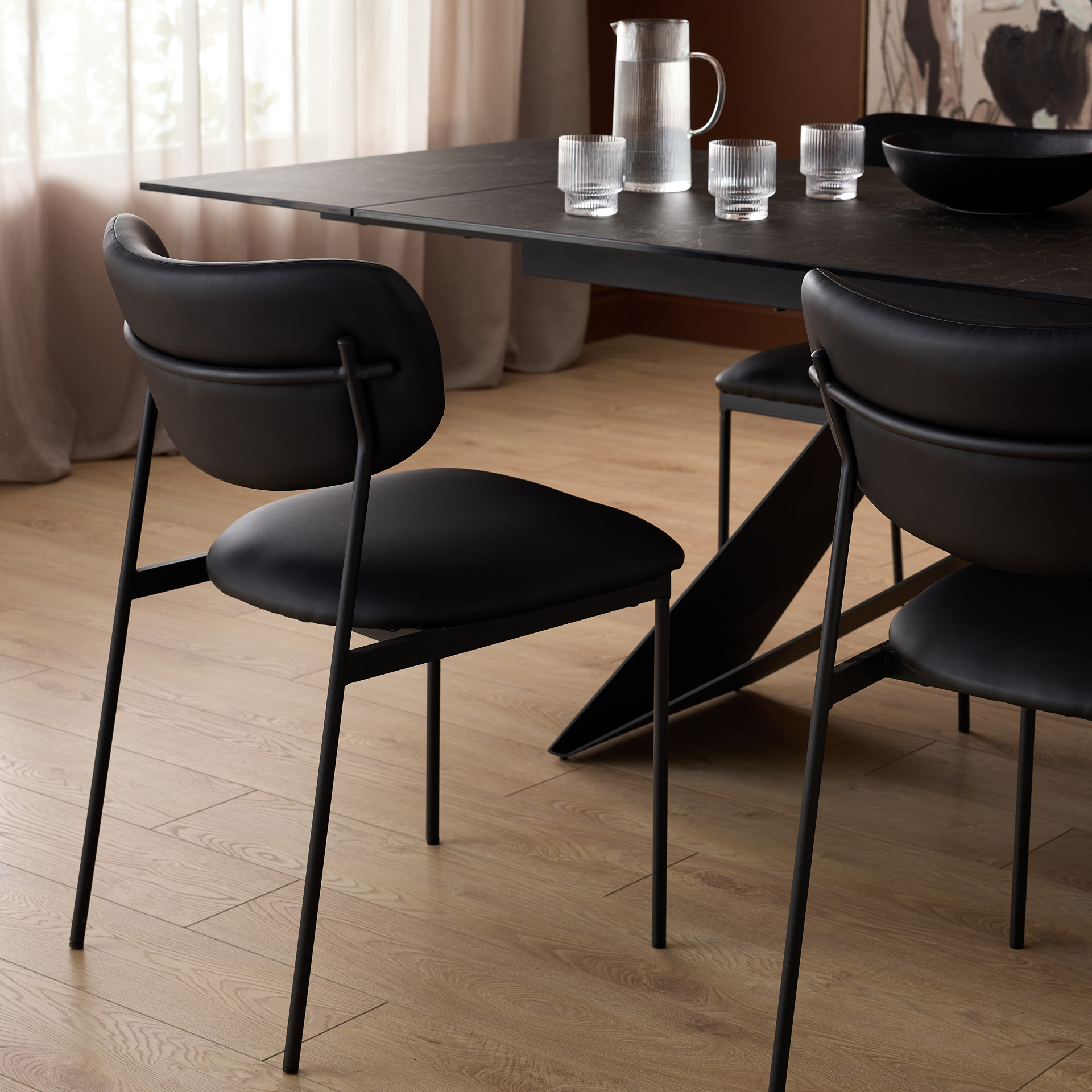 L’association du plateau en céramique italienne effet marbre et des chaises en cuir synthétique noir crée une atmosphère à la fois chic et chaleureuse, idéale pour les intérieurs modernes.