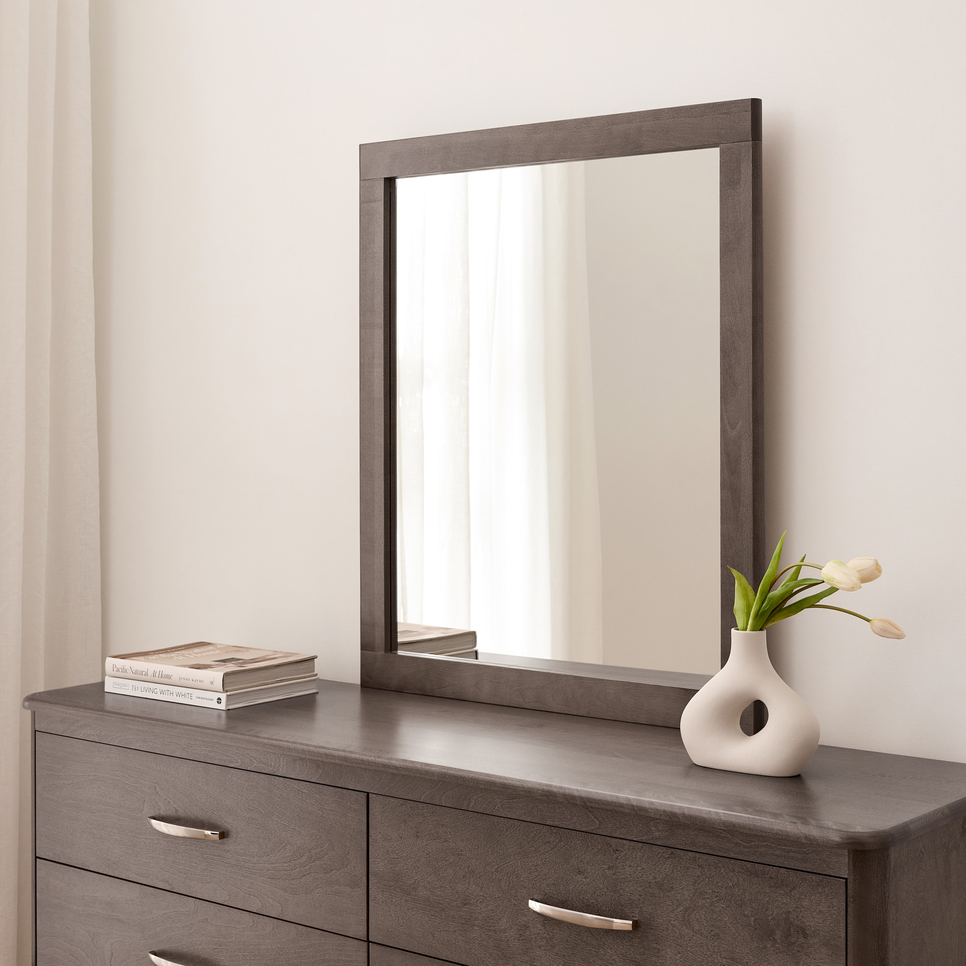 Son format pratique apporte luminosité et profondeur à votre espace, tout en s’intégrant facilement au-dessus de la commode.