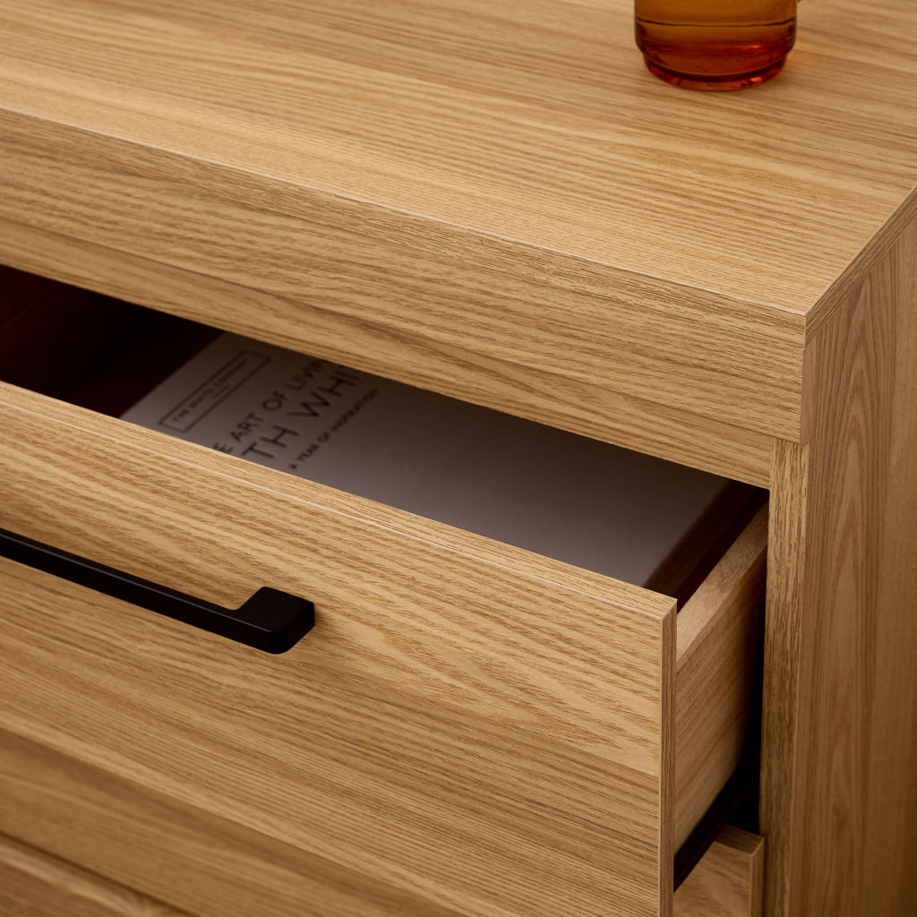 Les lignes droites et la texture naturelle du bois créent une atmosphère chaleureuse et minimaliste. Les poignées en métal noir apportent un contraste raffiné et soulignent le caractère sobre du meuble.