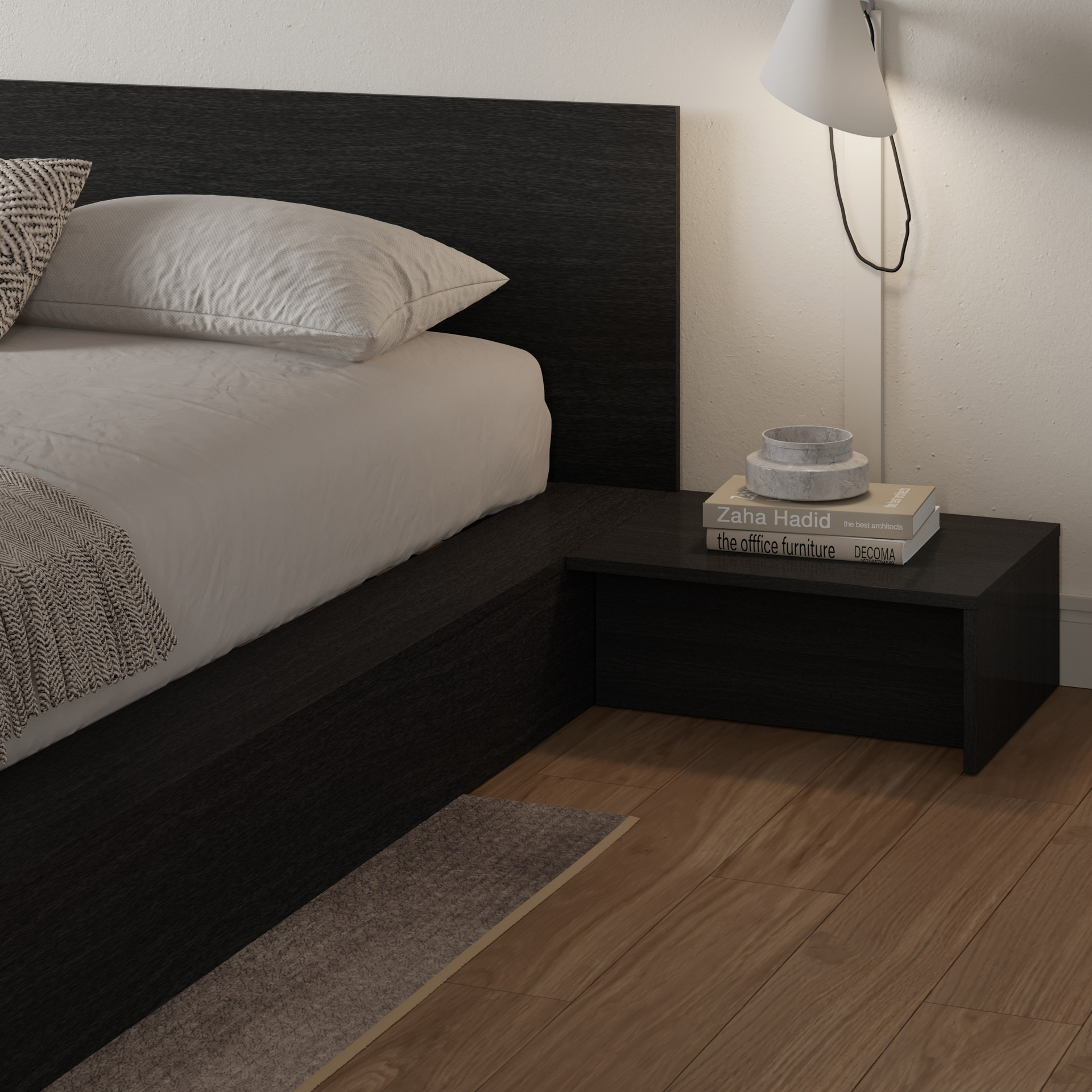 Sa conception minimaliste favorise une ambiance ouverte et apaisante, tandis que ses larges bords offrent un espace pratique pour garder vos essentiels à portée de main. Les tables de chevet, compactes et fonctionnelles, s’intègrent naturellement à cet ensemble. Leur surface spacieuse est idéale pour une lampe, des livres ou des objets décoratifs, ajoutant une touche de praticité sans compromettre l’esthétique.