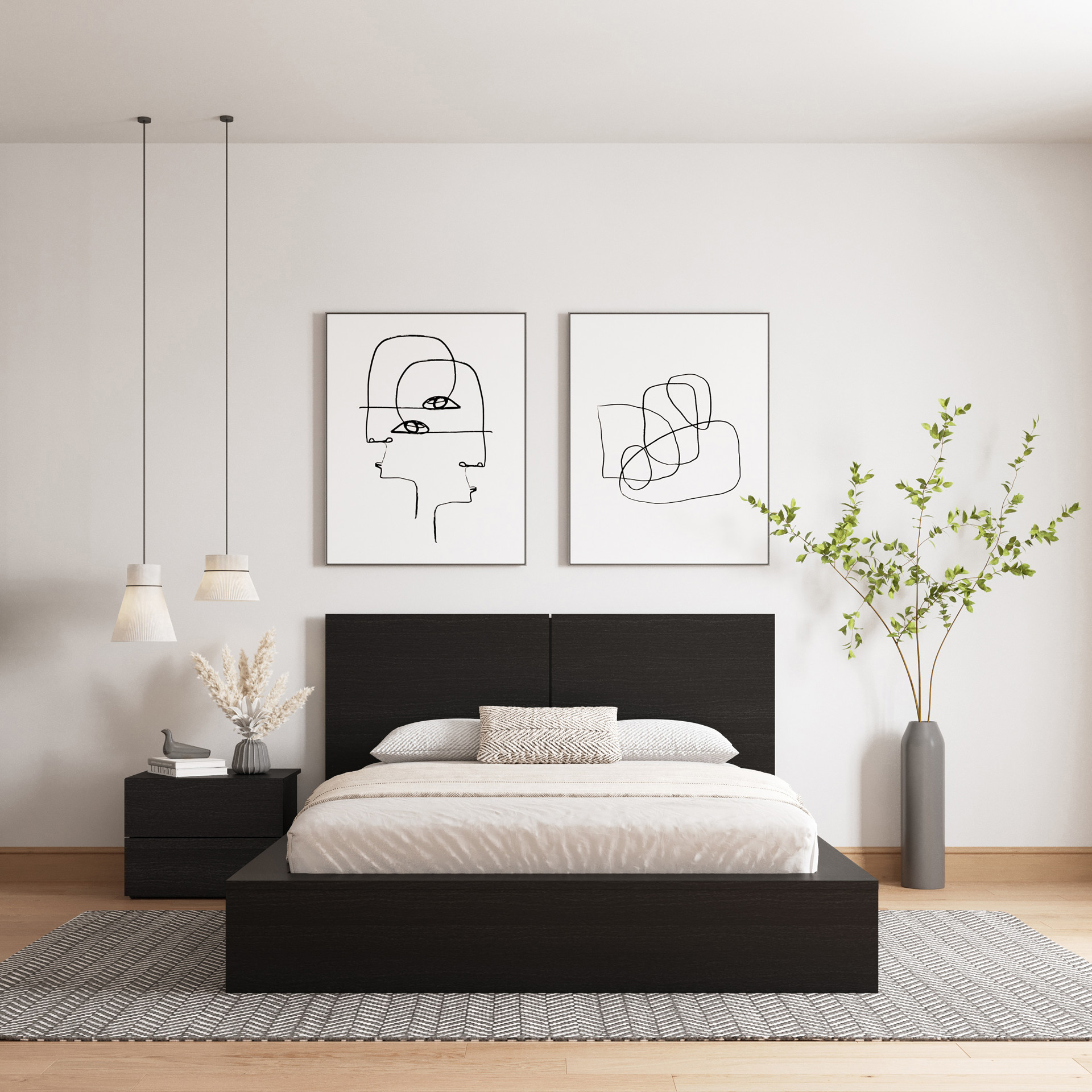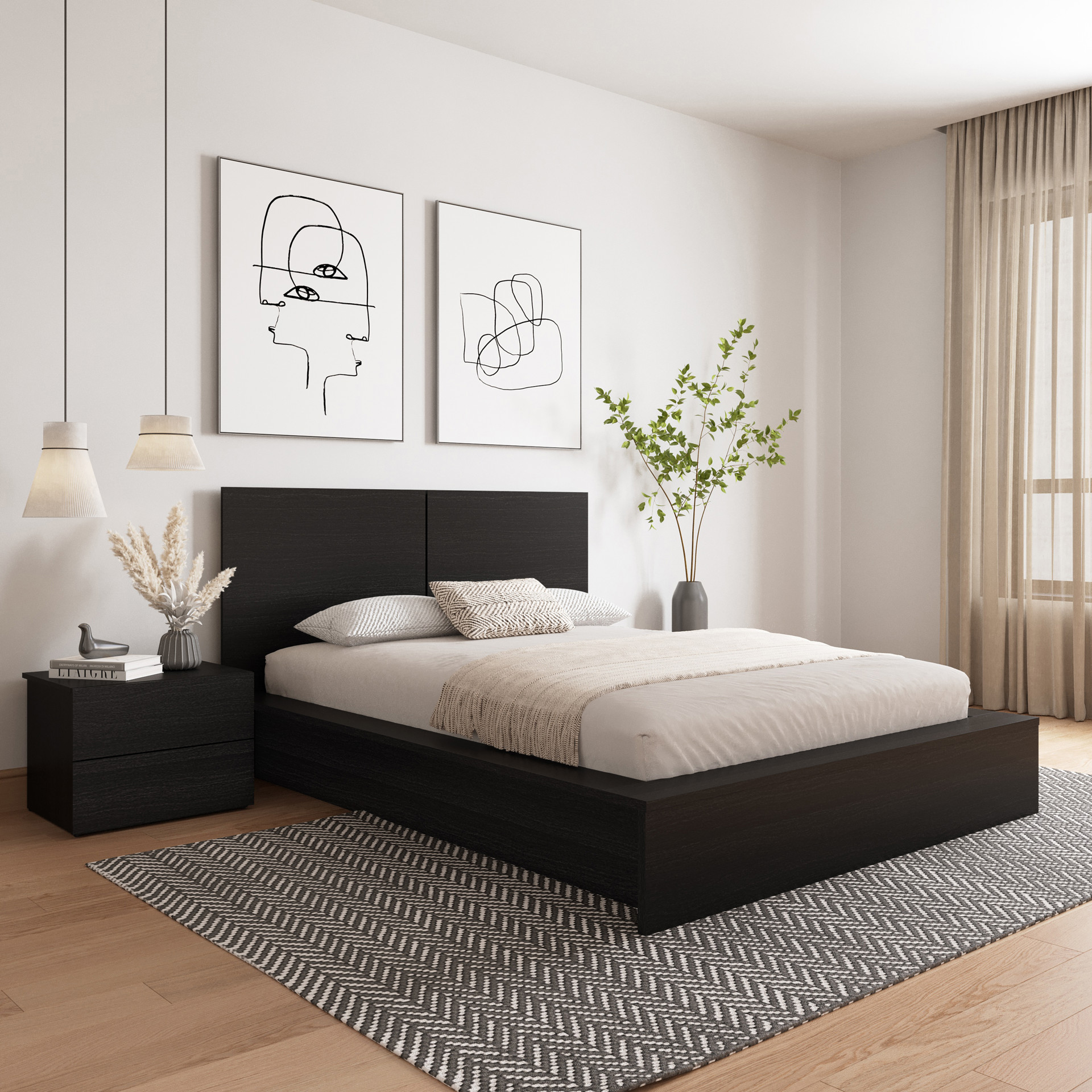Les surfaces spacieuses des tables de chevet offrent à la fois style et commodité, idéales pour vos livres ou vos appareils de charge. Le design rectangulaire polyvalent s'harmonise parfaitement avec différents styles de décoration, tandis que les supports centraux et la base cachée créent un effet de flottement unique dans votre pièce.