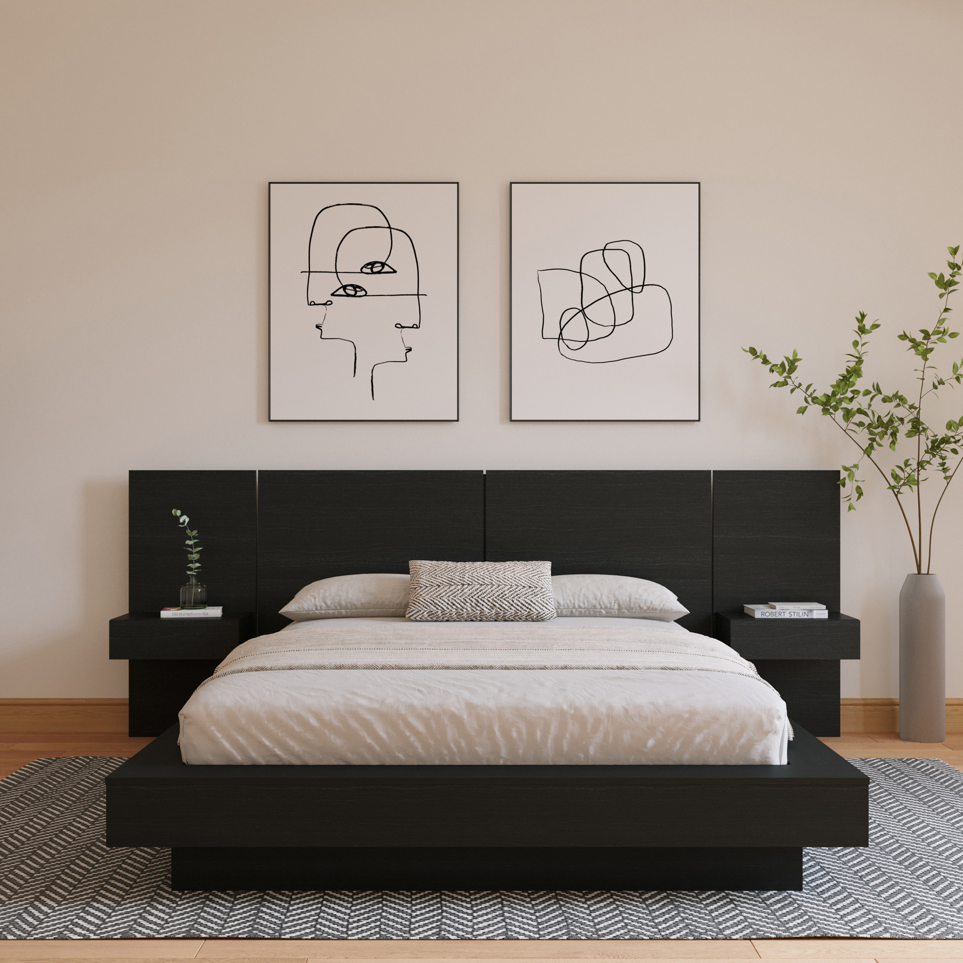 Ce grand lit élégant réinvente le concept du luxe, mettant en valeur une somptueuse tête de lit avec des panneaux d'extension intégrés et des tables de chevet flottantes, le tout accentuant la beauté.