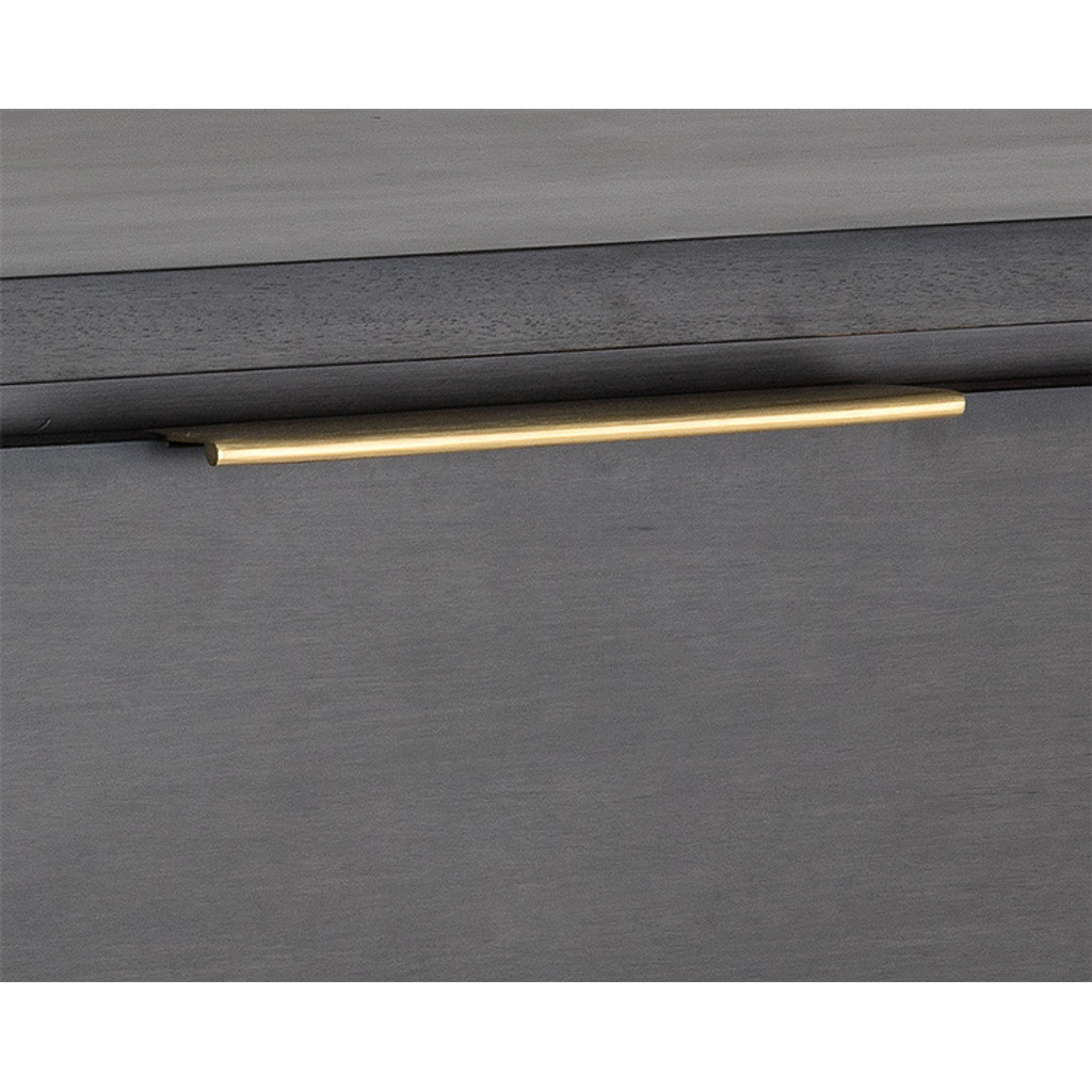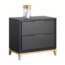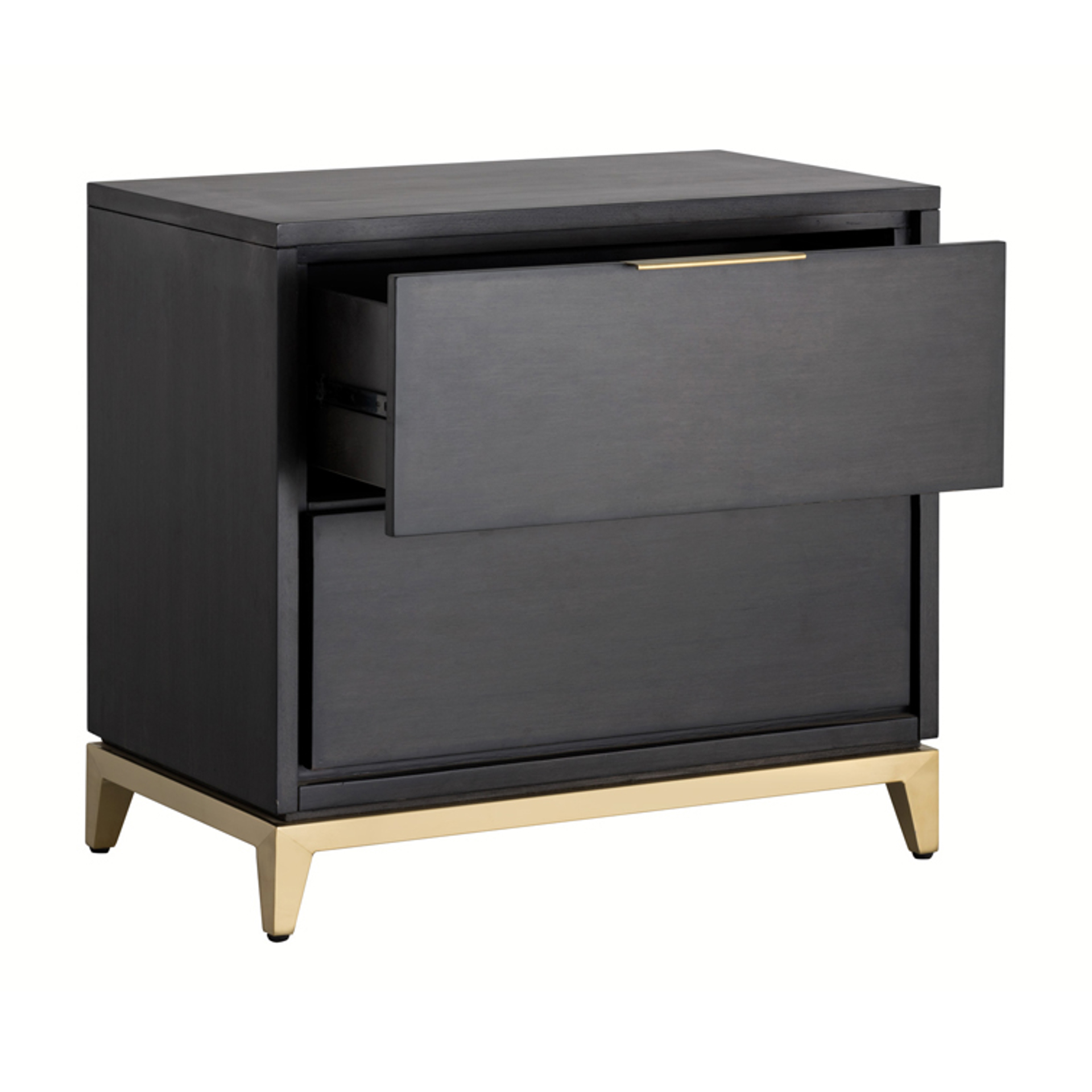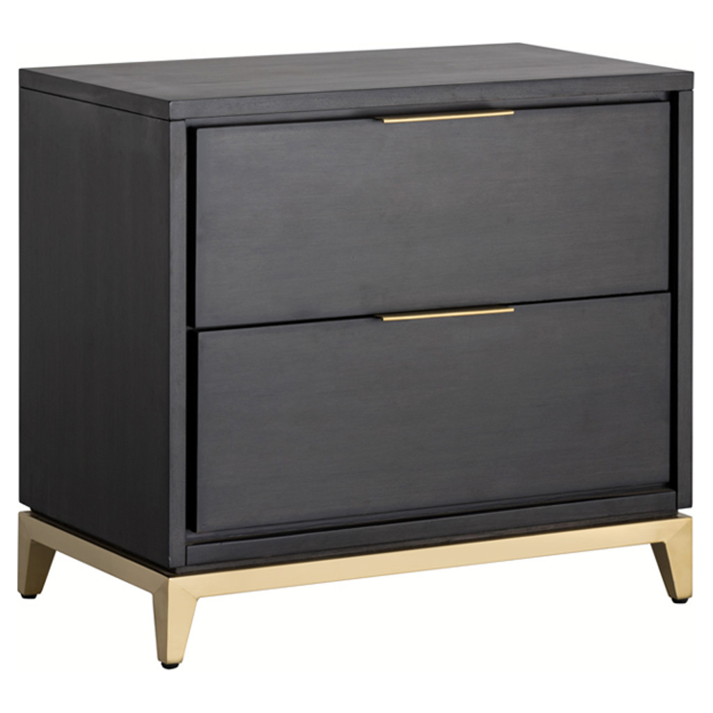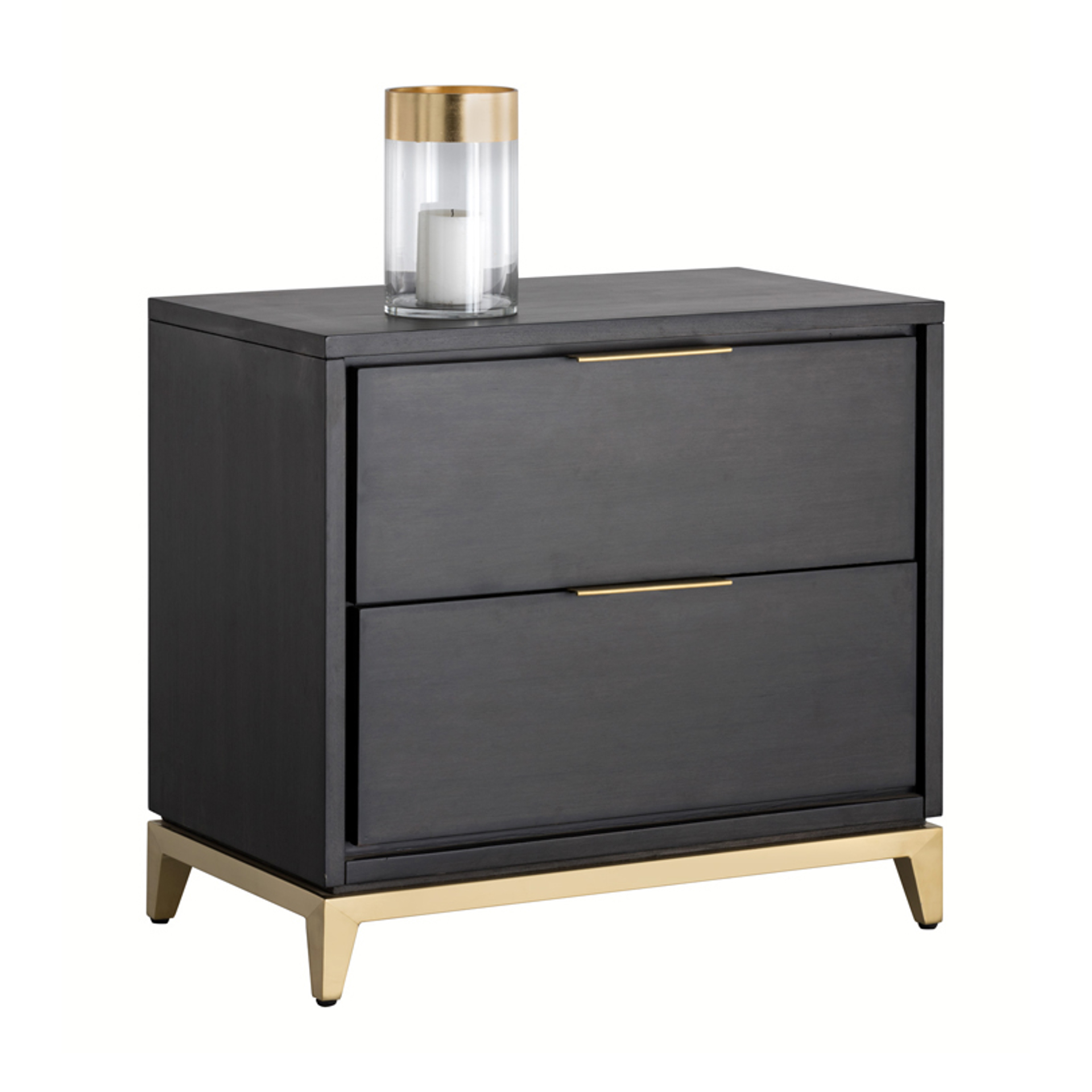 Cette table de chevet de la collection Irongate par Sunpan ajoutera de la chaleur et de l'attrait à n'importe quel espace de chambre. Fabriqué en placage de bois d'acacia dans une finition gris-brun fumé avec deux tiroirs profonds à fermeture douce. Les poignées et la base en acier or jaune brossé complètent le look.