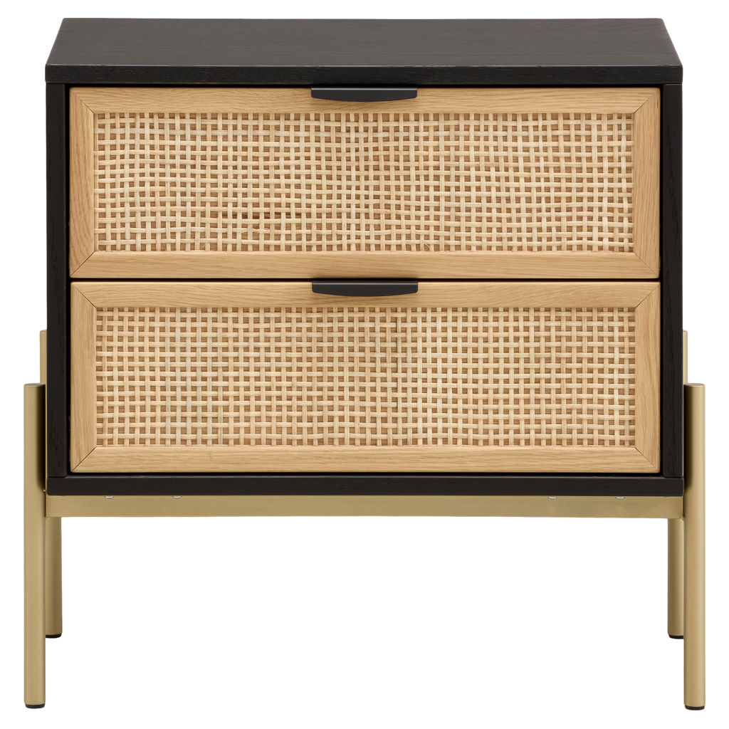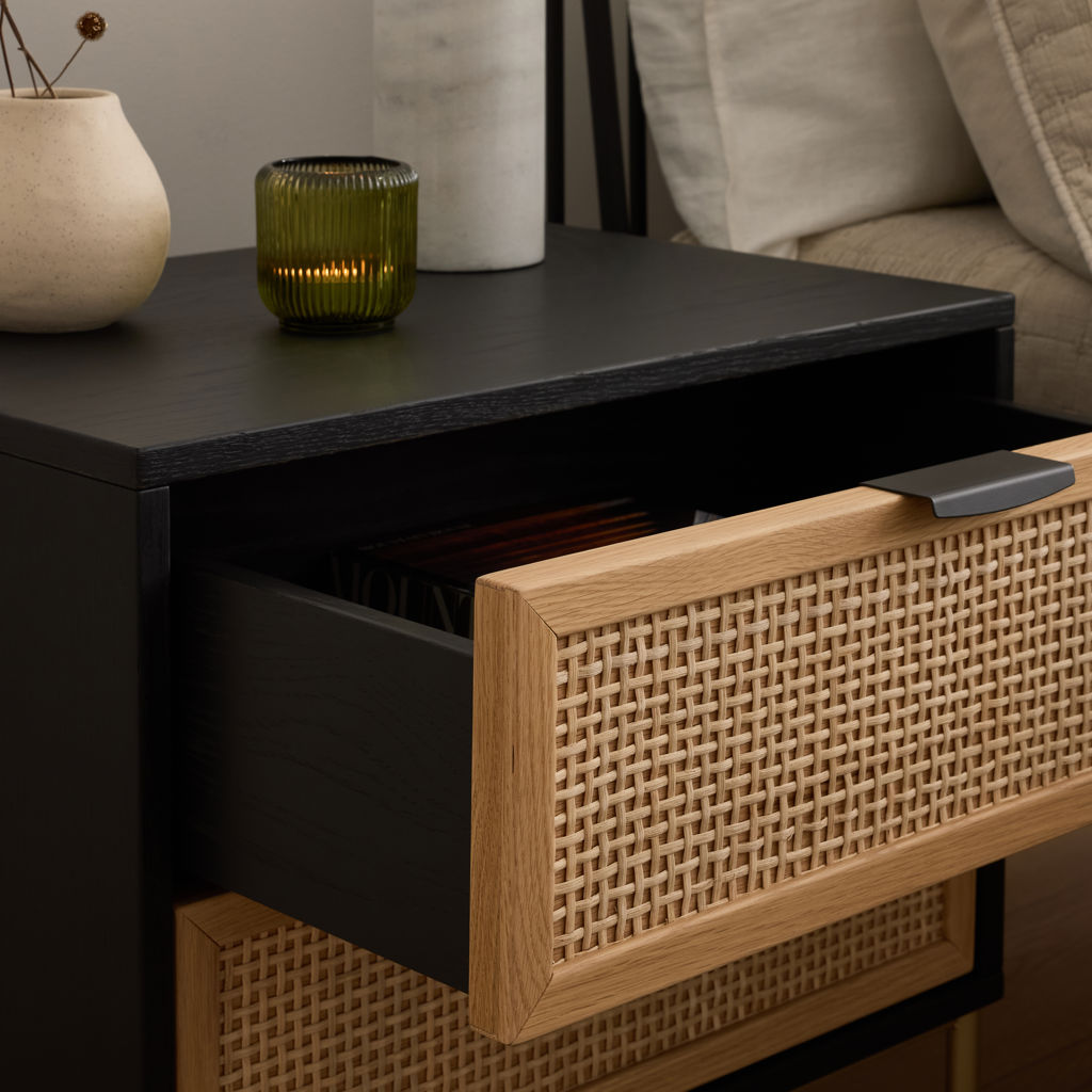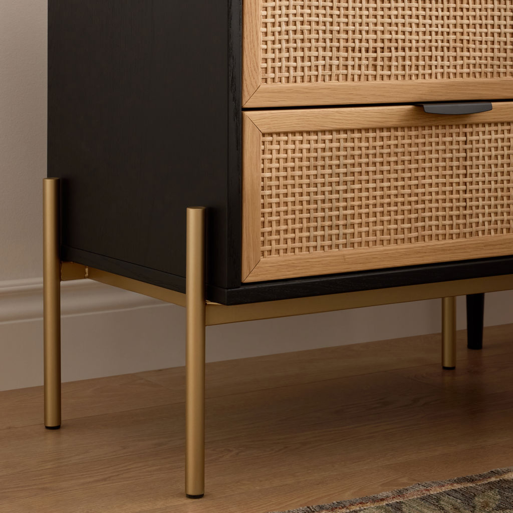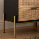 Ses tiroirs à façade tressée offrent une texture naturelle et chaleureuse, tandis que la structure contrastante et la base métallique apportent stabilité et élégance.