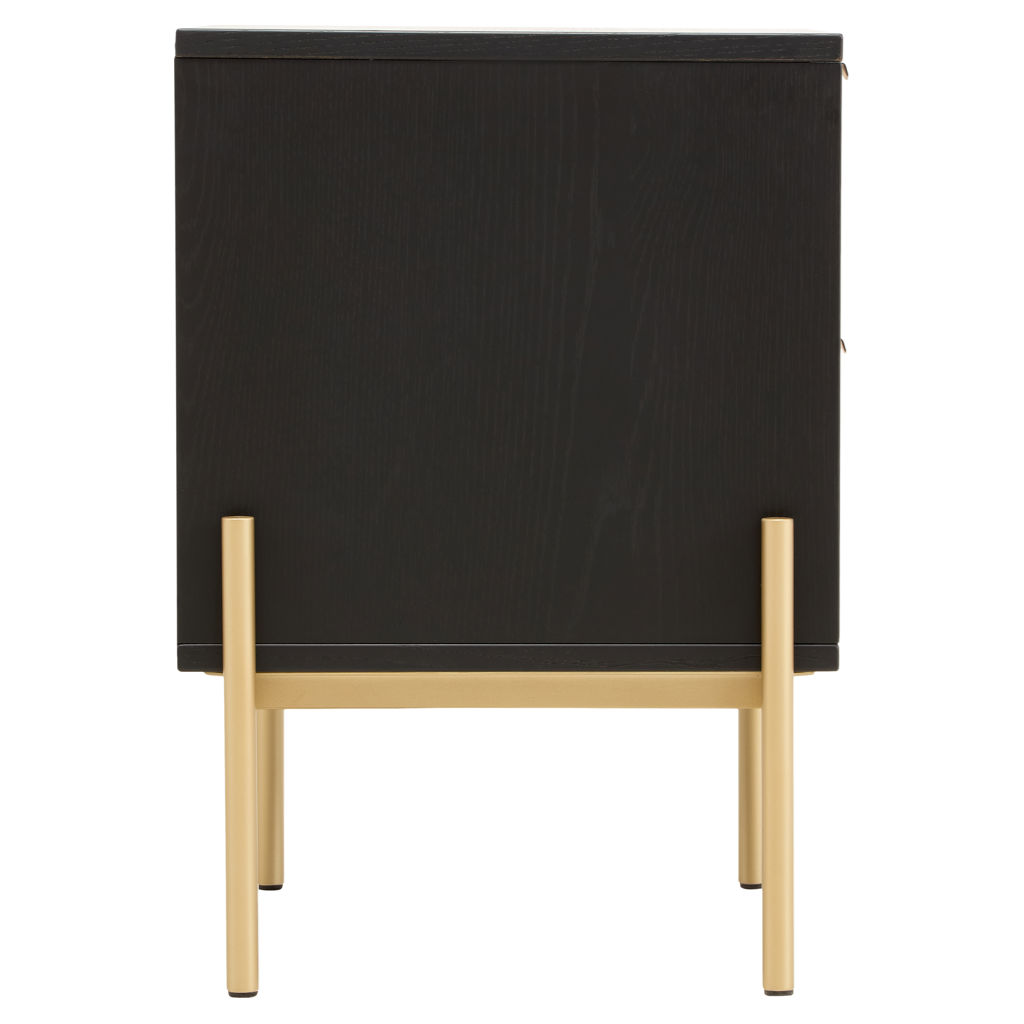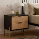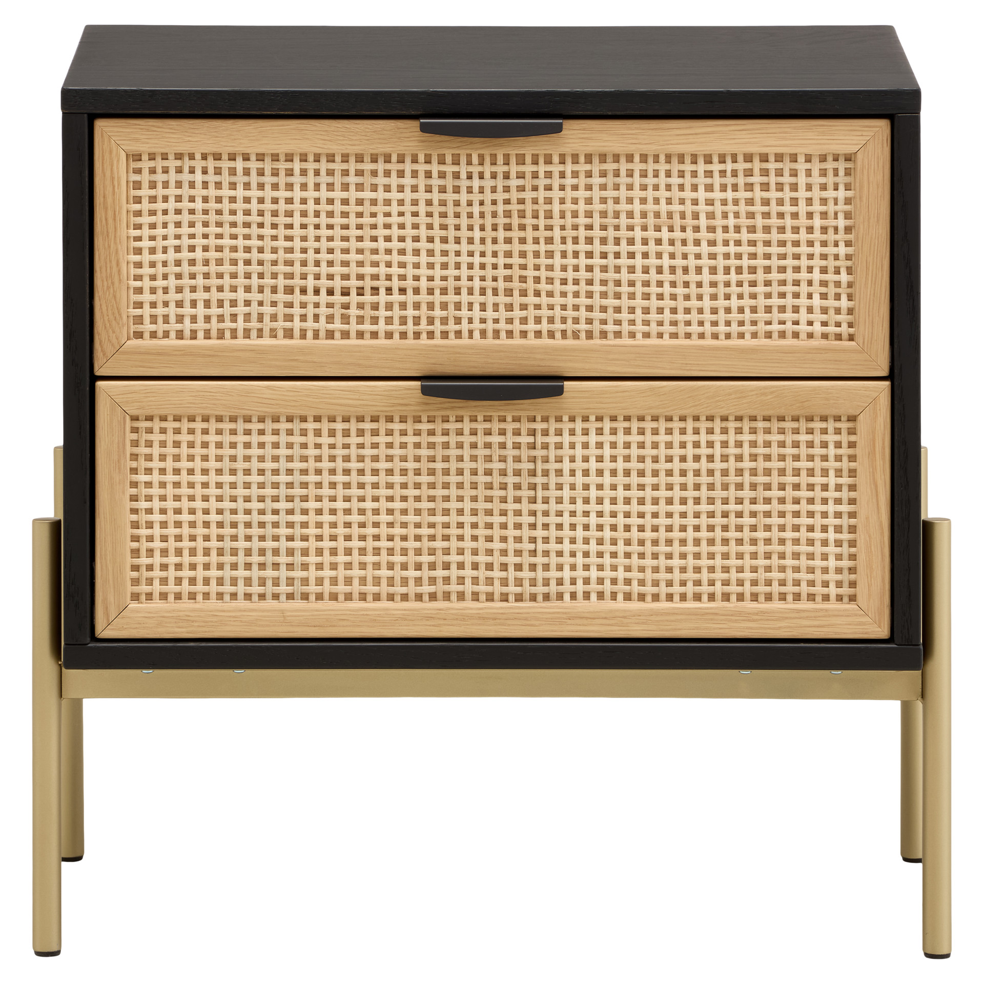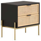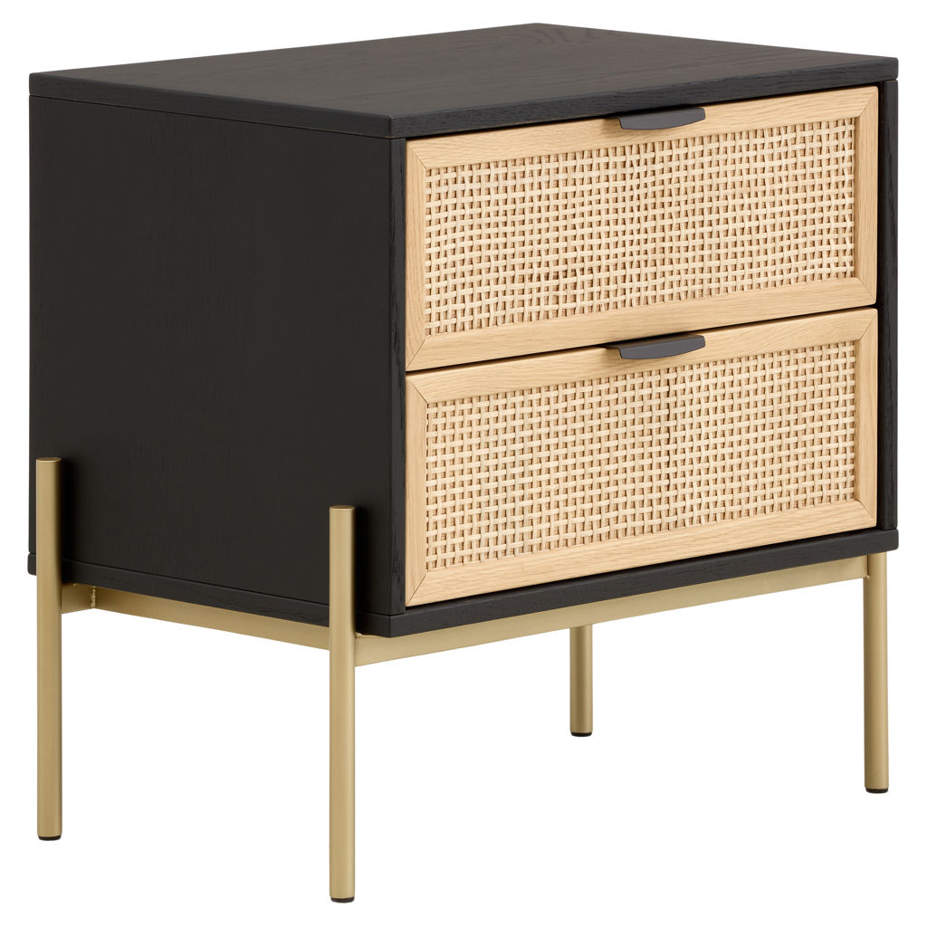 Ses tiroirs à façade tressée offrent une texture naturelle et chaleureuse, tandis que la structure contrastante et la base métallique apportent stabilité et élégance.