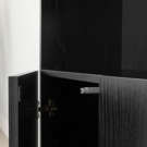 La bibliothèque principale, un peu plus large que les 2 autres, cache 2 tablettes ajustables derrière ses 4 portes sans poignées. Les 2 étagères étroites proposent quant à elles jusqu´à 6 configurations en matière de divisions et d´orientation des portes. À l´aide de l´ingénieux mécanisme à boutons-poussoirs, ouvrez les portes avec une simple pression. La découpe droite et nette de cet ensemble d´étagères créera une ambiance harmonieuse.