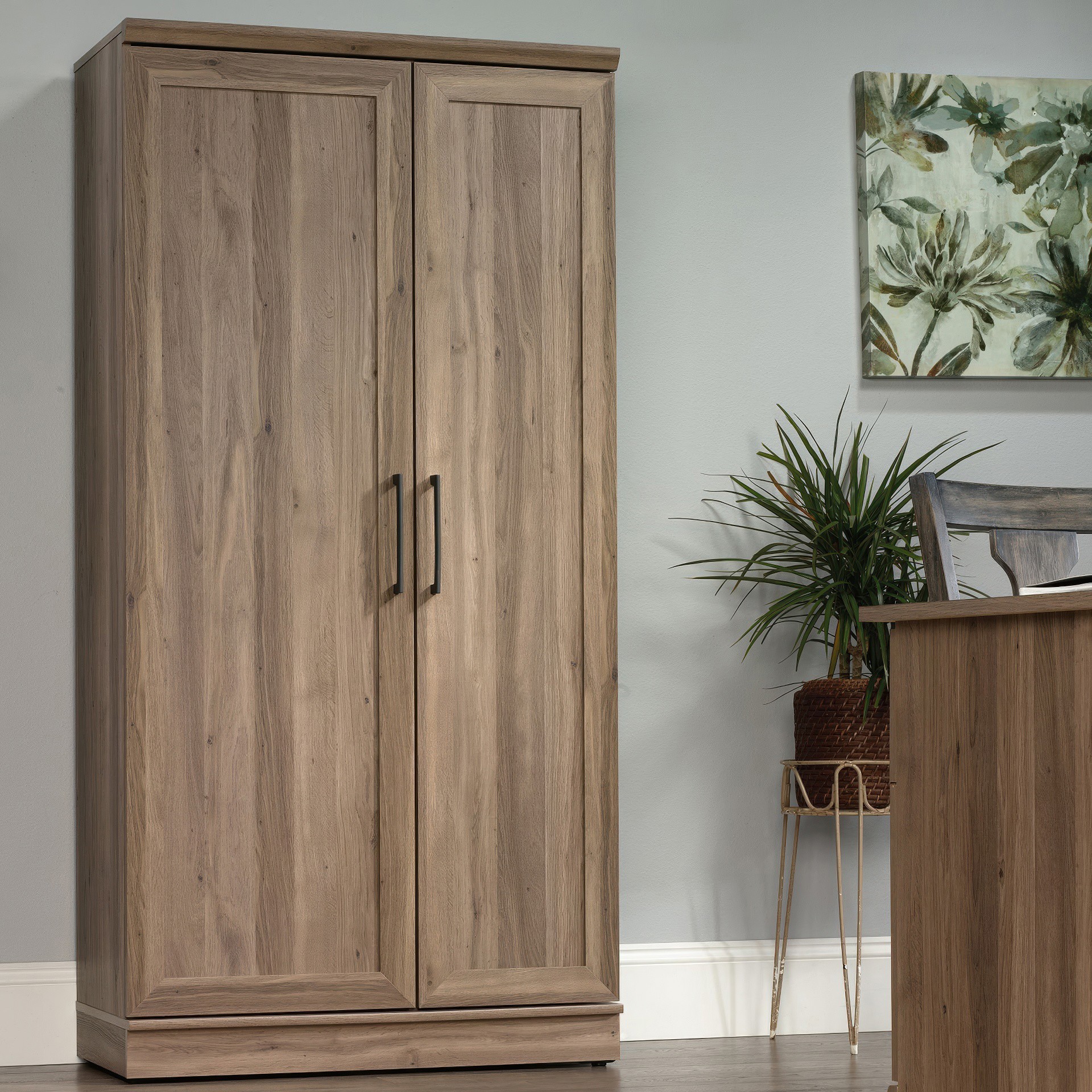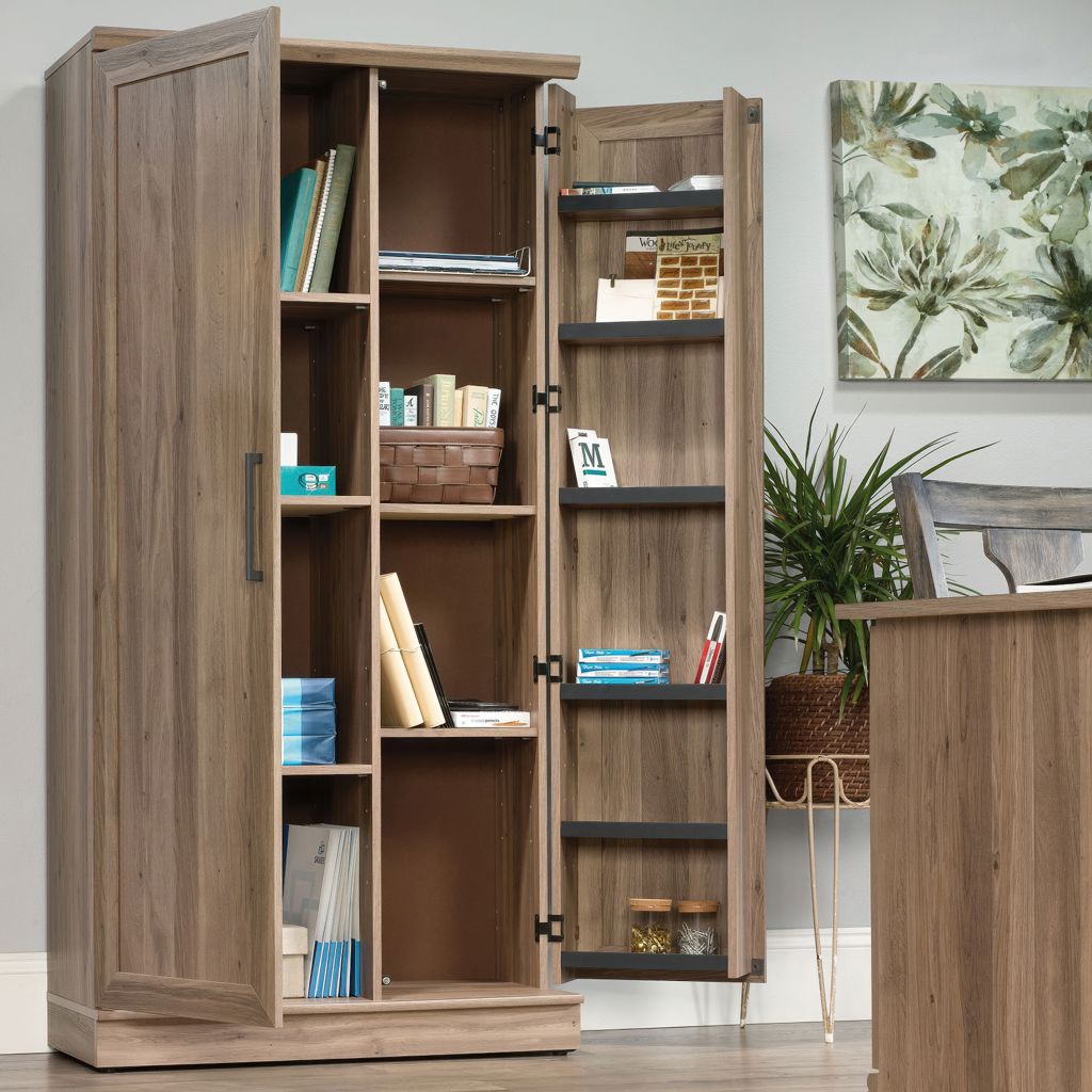 L'une des portes contient un rangement pivotant avec trois étagères réglables et trois étagères fixes pour une variété infinie d'options de personnalisation - parfait pour un espace de bureau !