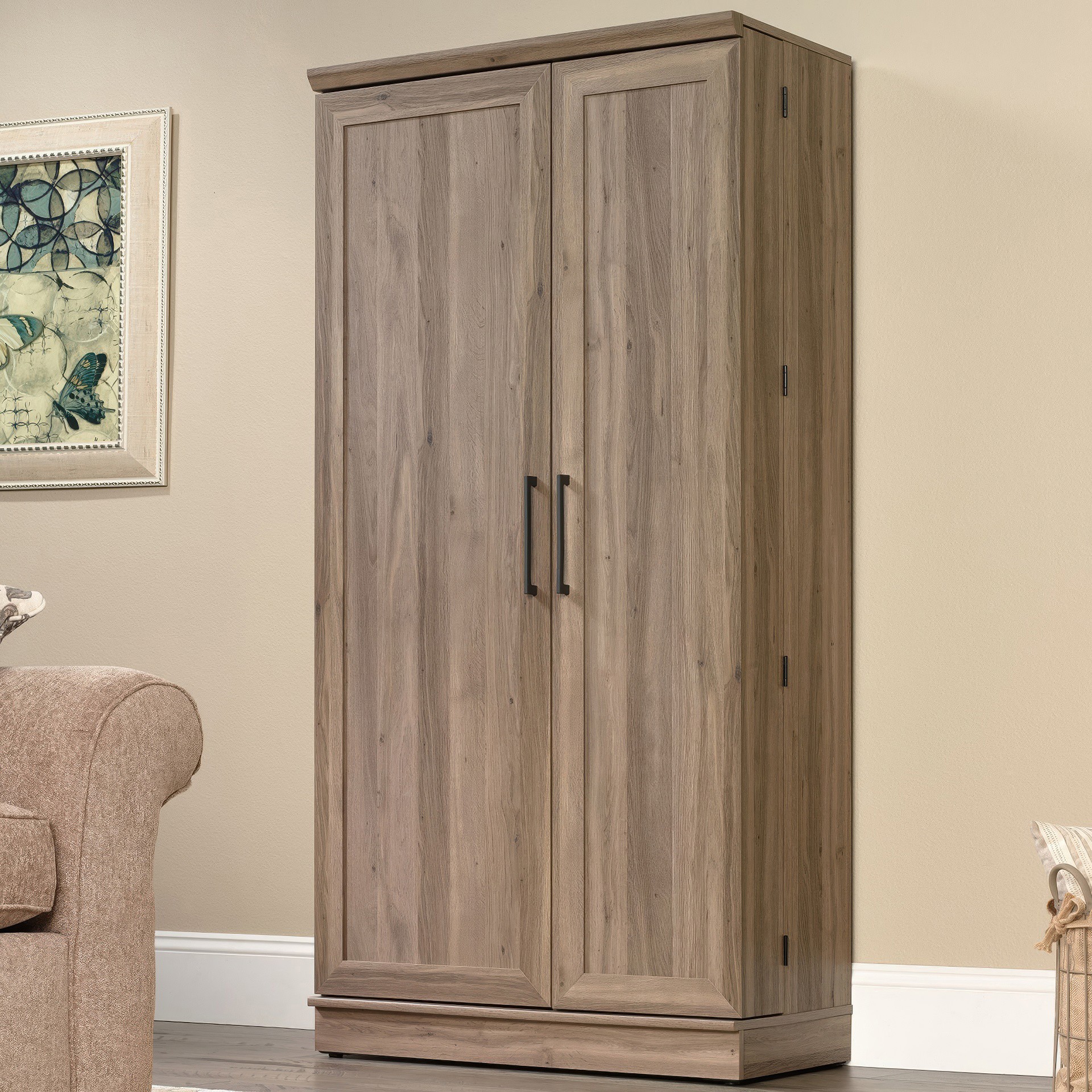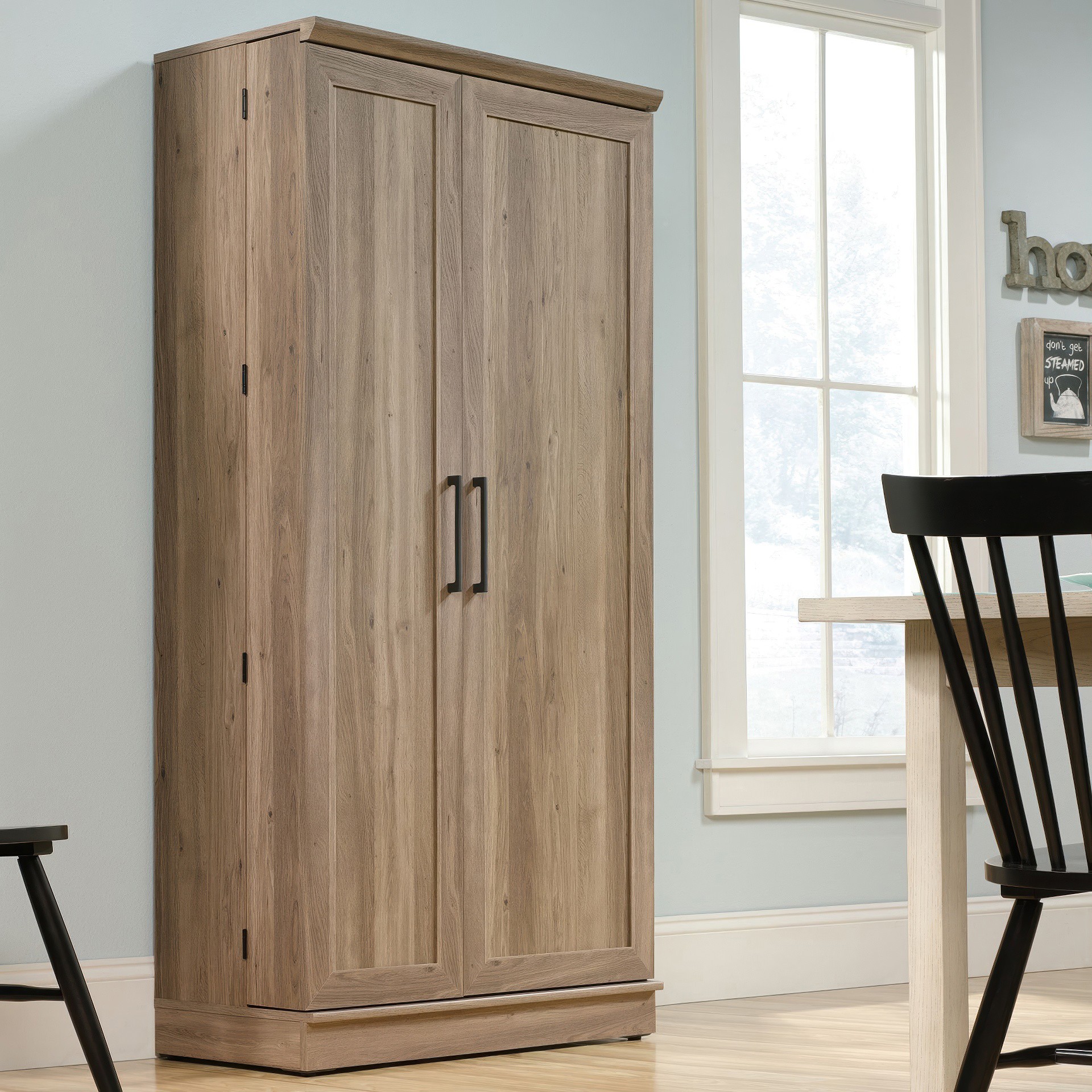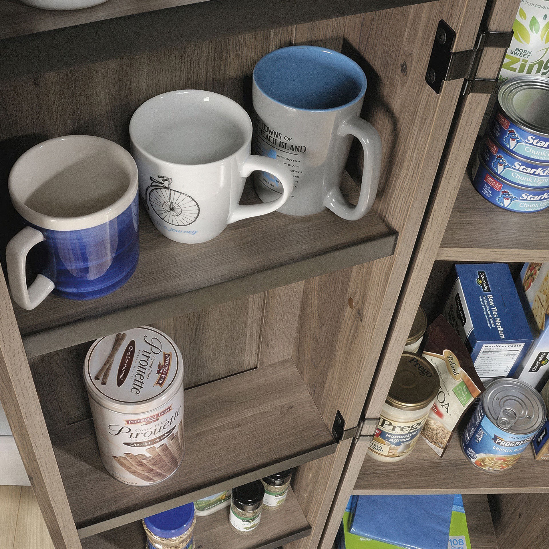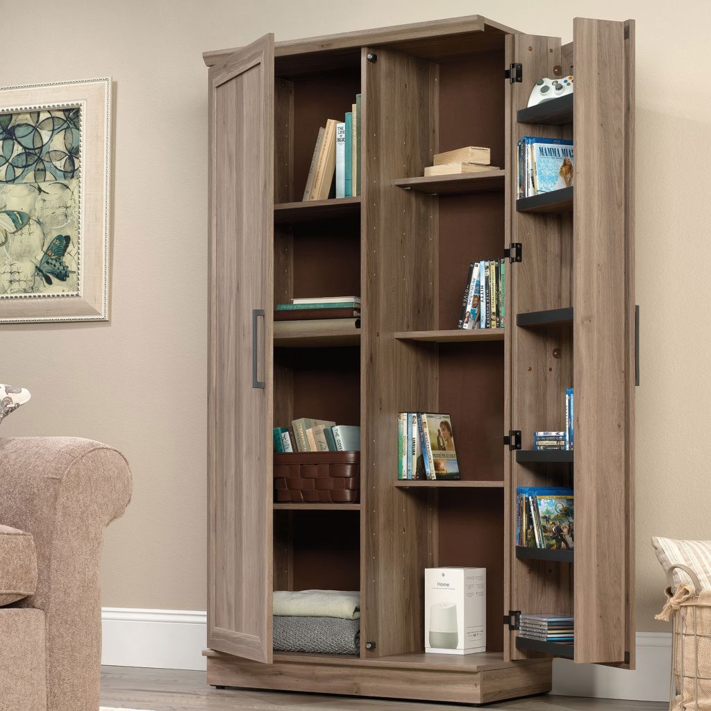 Derrière chaque porte à panneaux encadrés se trouvent deux étagères réglables et une étagère fixe pour ranger les fournitures de bricolage, le savon à lessive, les serviettes et bien d'autres choses encore !