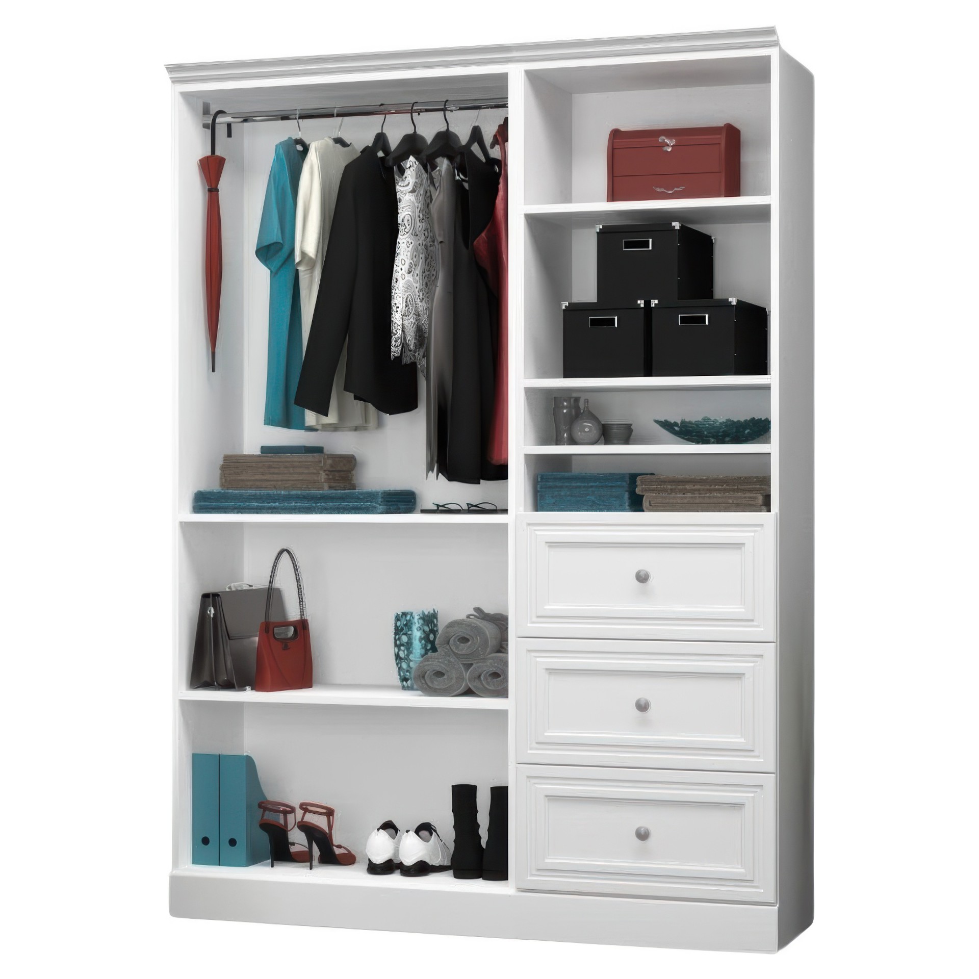 Cet ensemble de rangement comprend 1 Unité de rangement 25“ avec ensemble de 3 tiroirs et 1 Unité de rangement 36“. Tablettes durables d’une épaisseur 0,75“ avec fini en mélamine résistant aux rayures, aux taches et aux brûlures. Orné d’élégantes moulures couronnées.