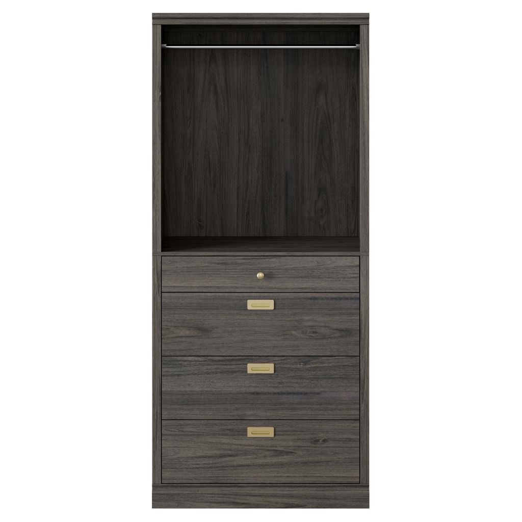 Rationalisez votre garde-robe avec ce composant du système de garde-robe Scott Living Nolan au fini Brown Alder. Utilisez le bouton de brosse doré ou l'une des trois poignées de brosse dorées pour ouvrir le tiroir et accéder facilement à vos objets rangés.