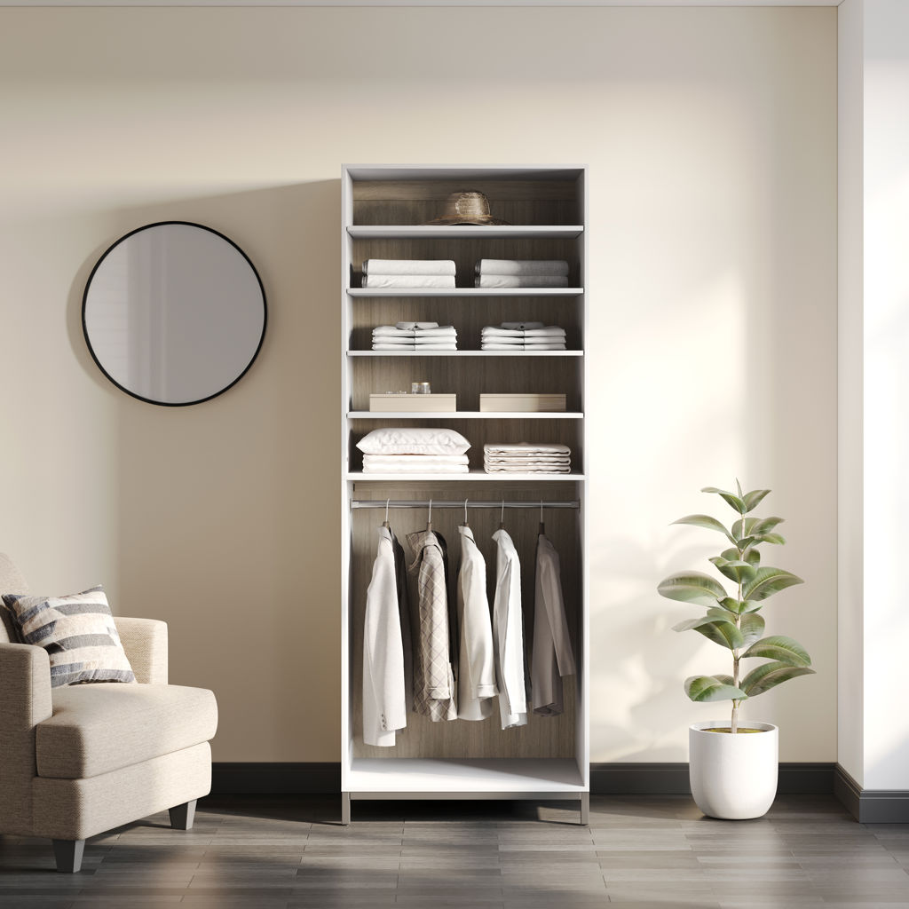 Personnalisez l'espacement des quatre étagères réglables et organisez votre espace de manière transparente. Le poteau métallique offre également une option pour les articles nécessitant des cintres.
