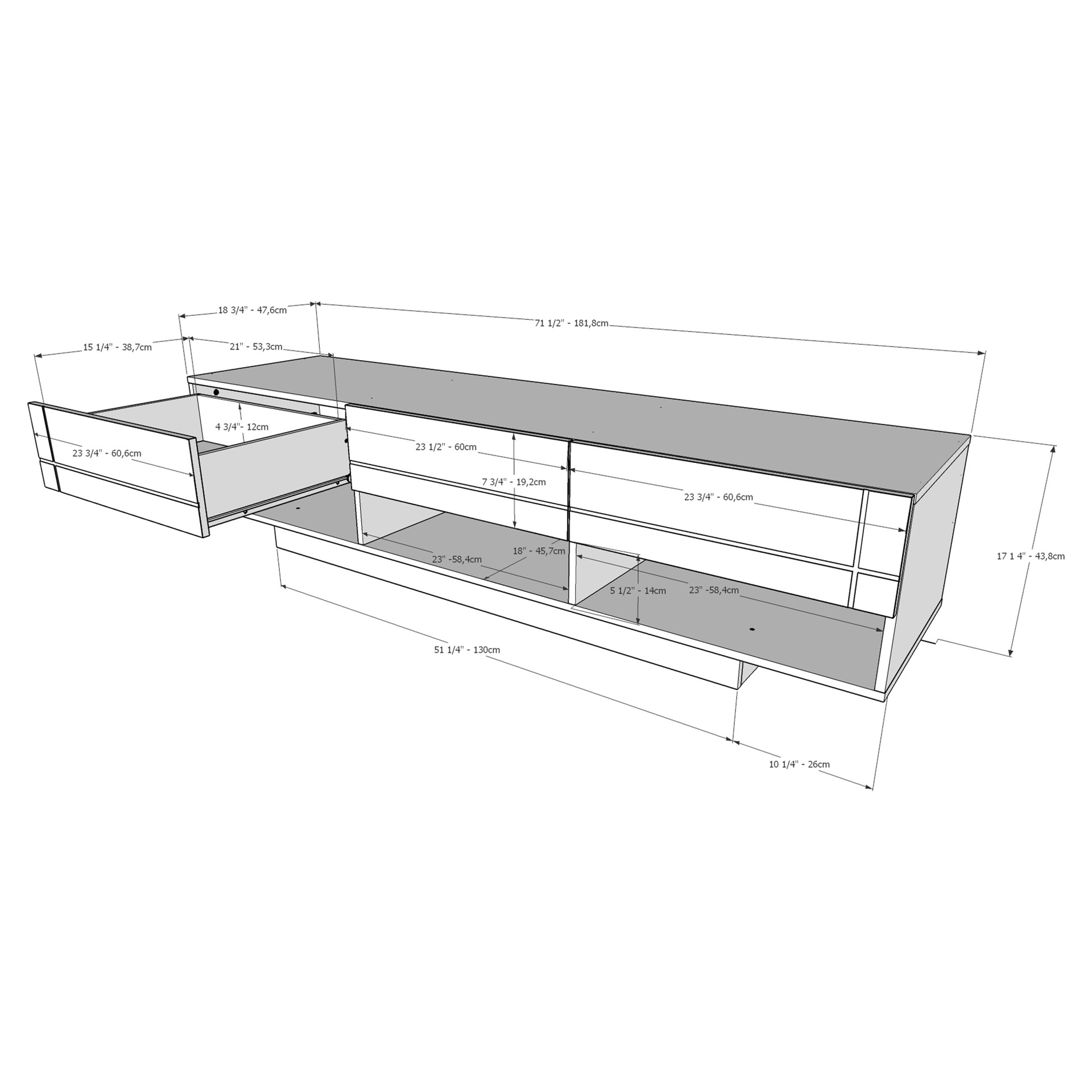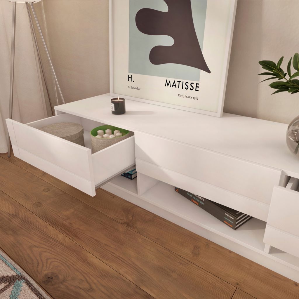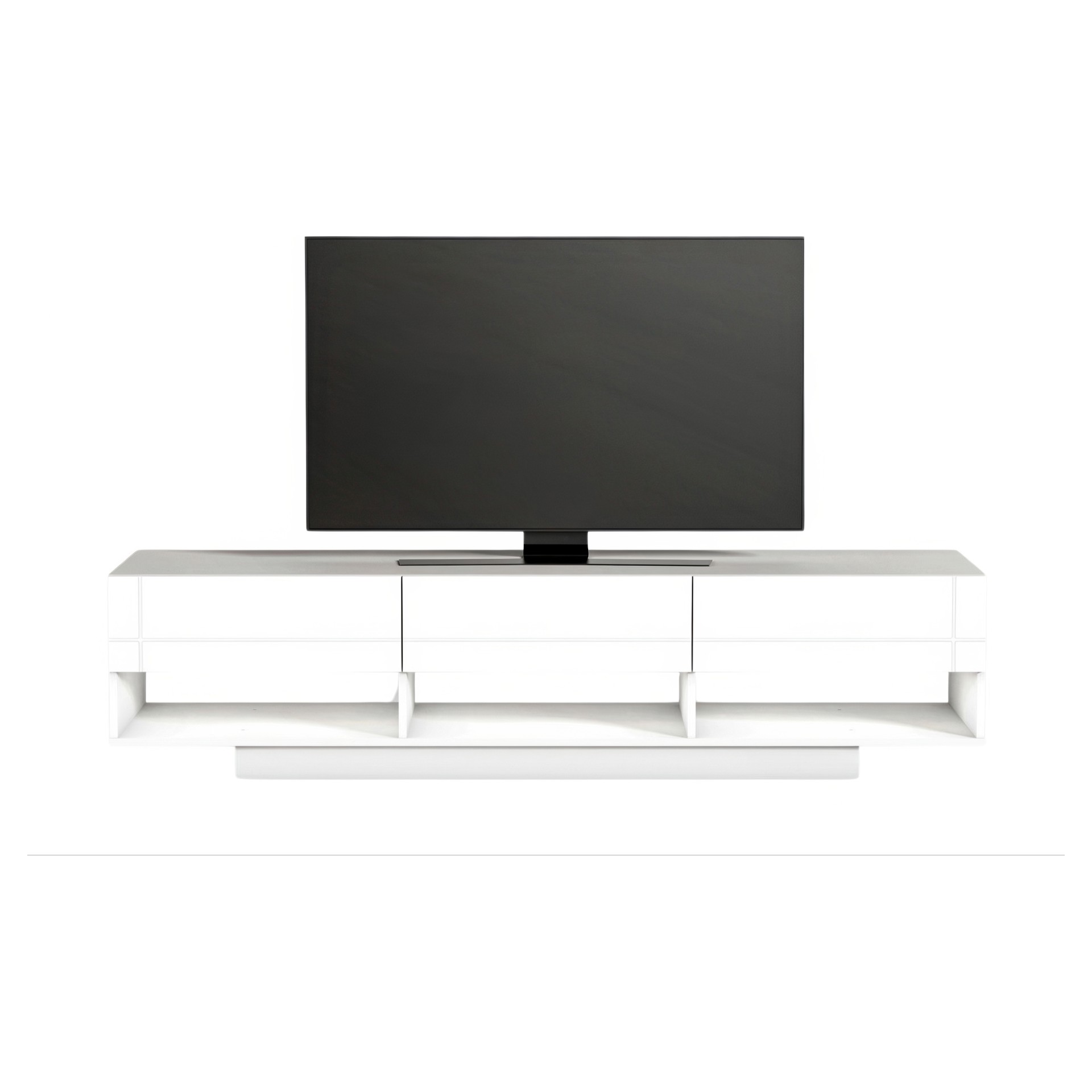 Le meuble télé 72 pouces Rustik est le complément parfait à votre salon avec ses 3 espaces de rangement ouverts pour afficher vos objets décoratifs et ses 3 tiroirs pour un espace de rangement fermé.