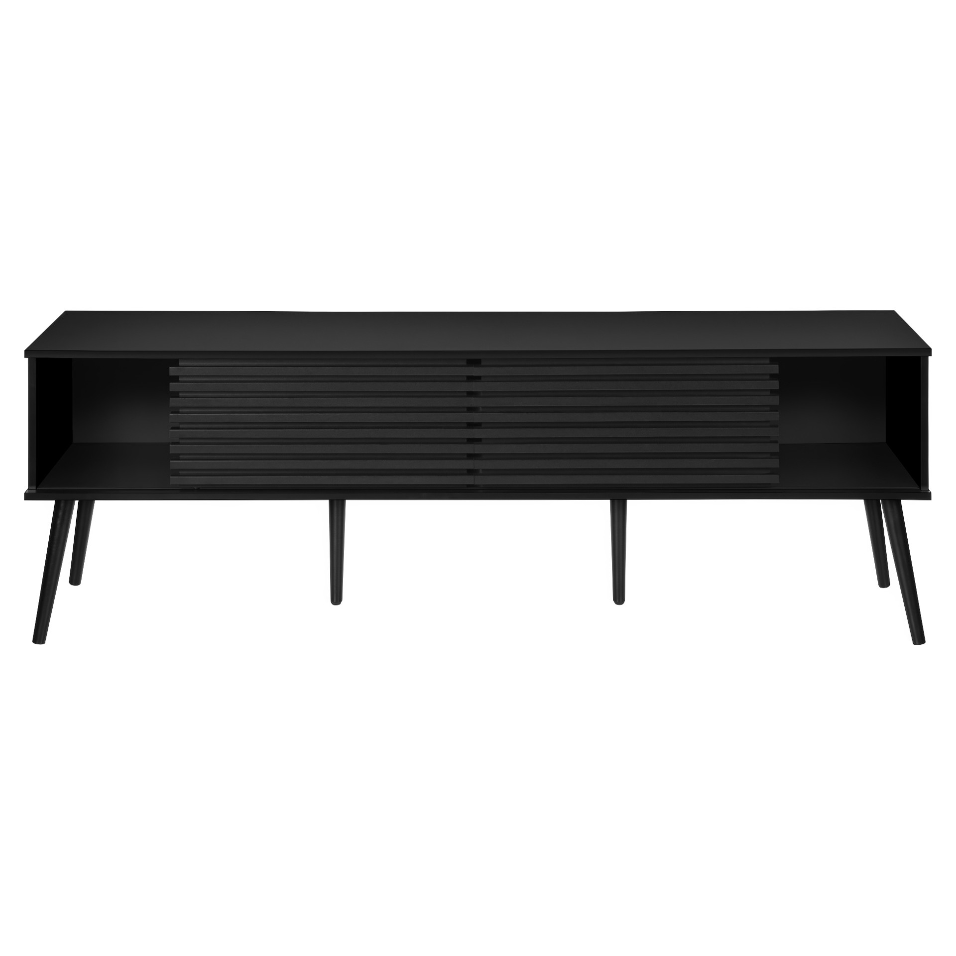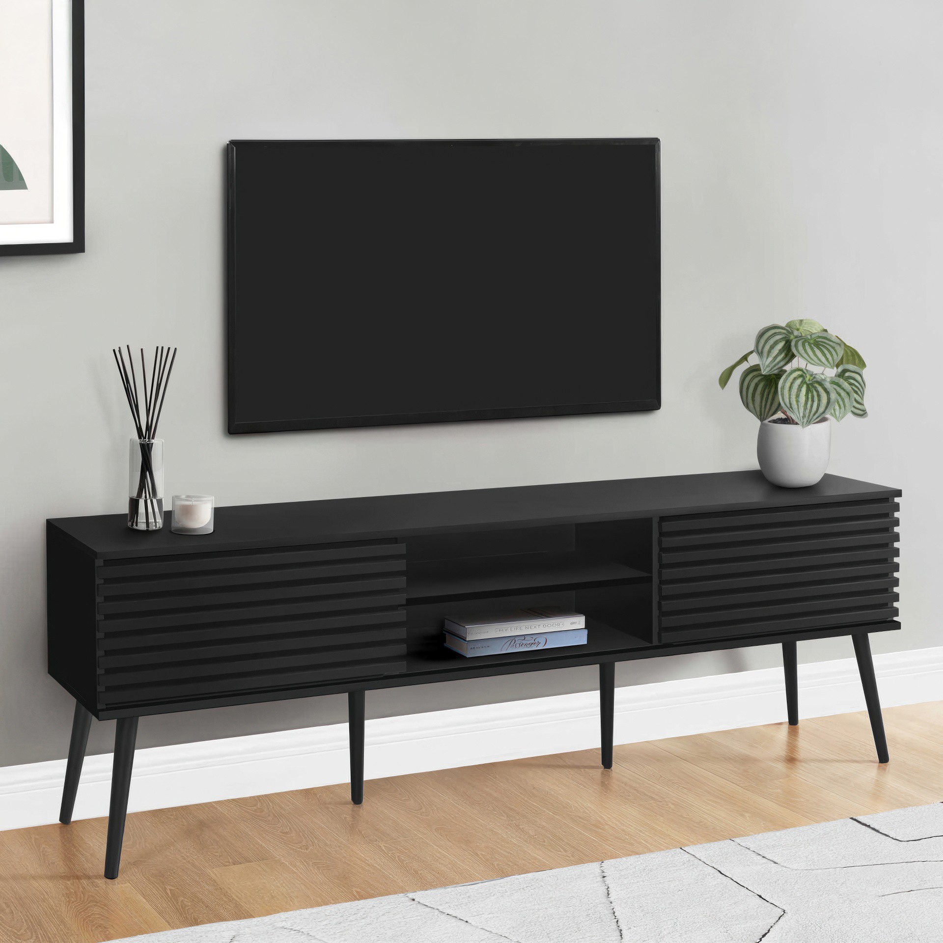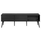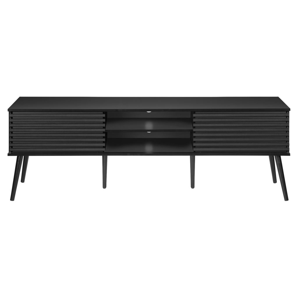 Construit avec des pieds en bois massif de conception durable, ce meuble TV offre à la fois des étagères de rangement ouvertes et des options de rangement fermées pour garder votre espace organisé et sans encombrement.