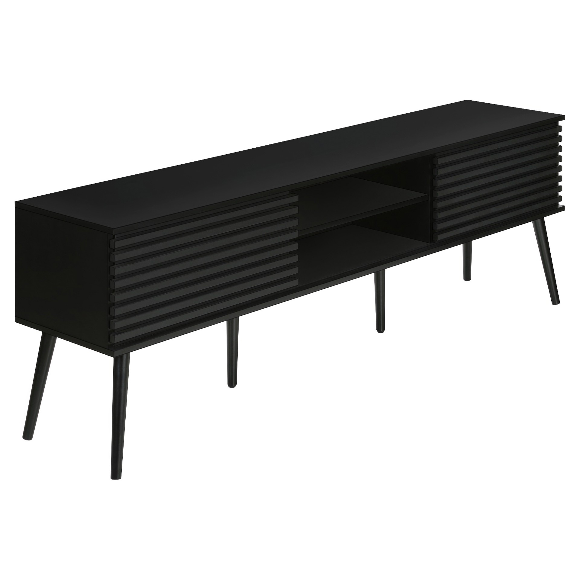 Les portes coulissantes avec panneaux sur les armoires de rangement ajoutent un style rétro, tandis que les trous de gestion des câbles derrière les étagères fixes permettent mettent en valeur les composants audio-visuels.