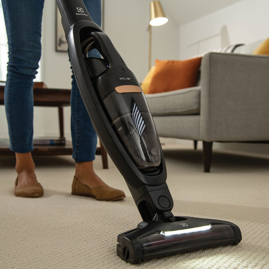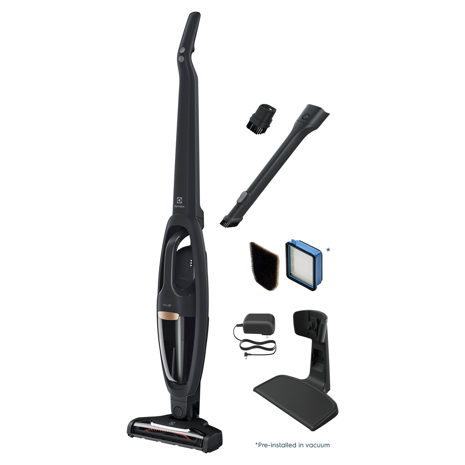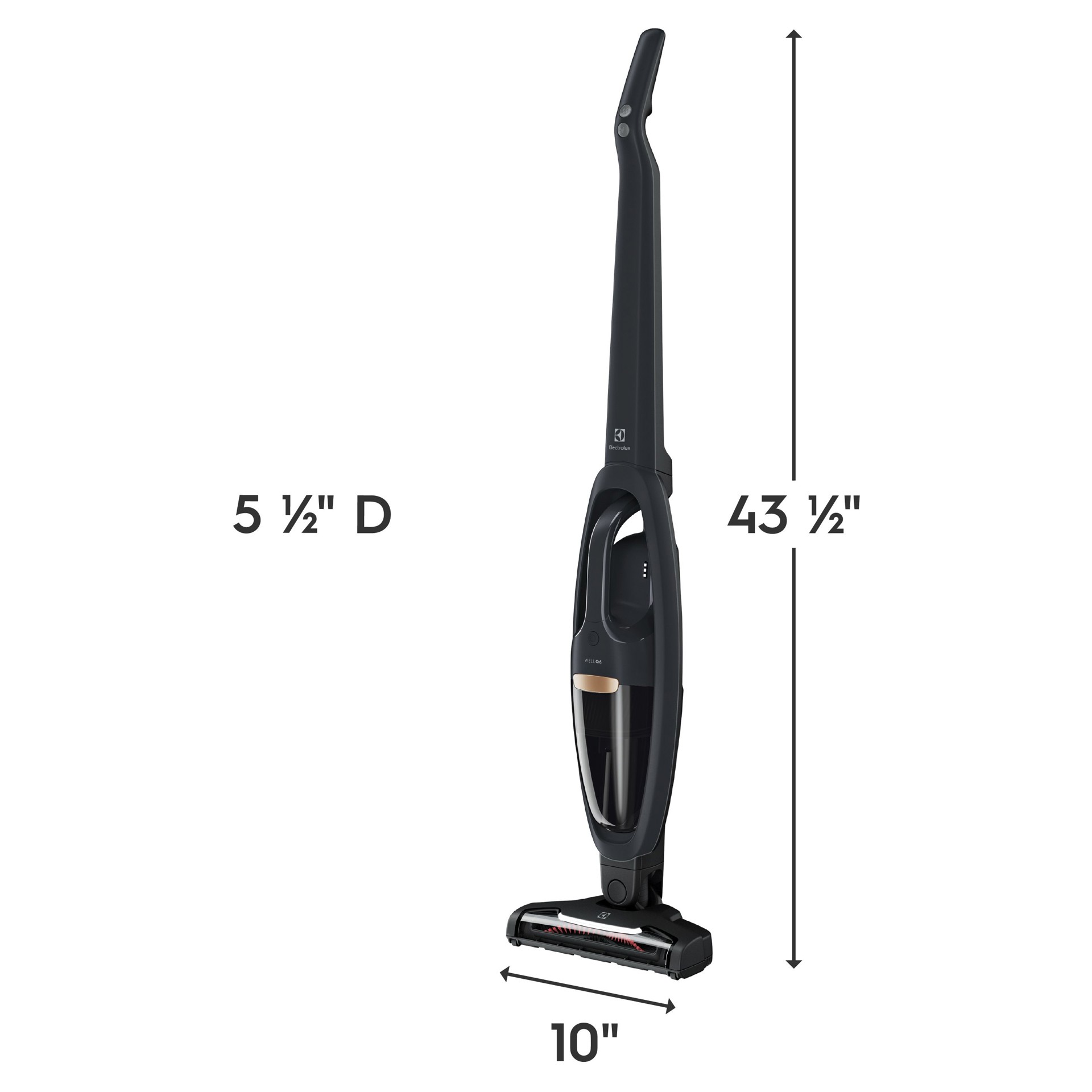 L'aspirateur sans fil 2-en-1 Electrolux WellQ7™ est doté d'un système de filtration en 5 étapes avec technologie cyclonique axiale intégrée qui sépare efficacement la saleté et la poussière de l'air, aidant à réduire le colmatage et à fournir une performance constante tout au long du nettoyage. La buse à poils motorisée a été conçue pour mieux éliminer la poussière fine et la saleté des tapis, du bois dur et d'autres types de sols courants.