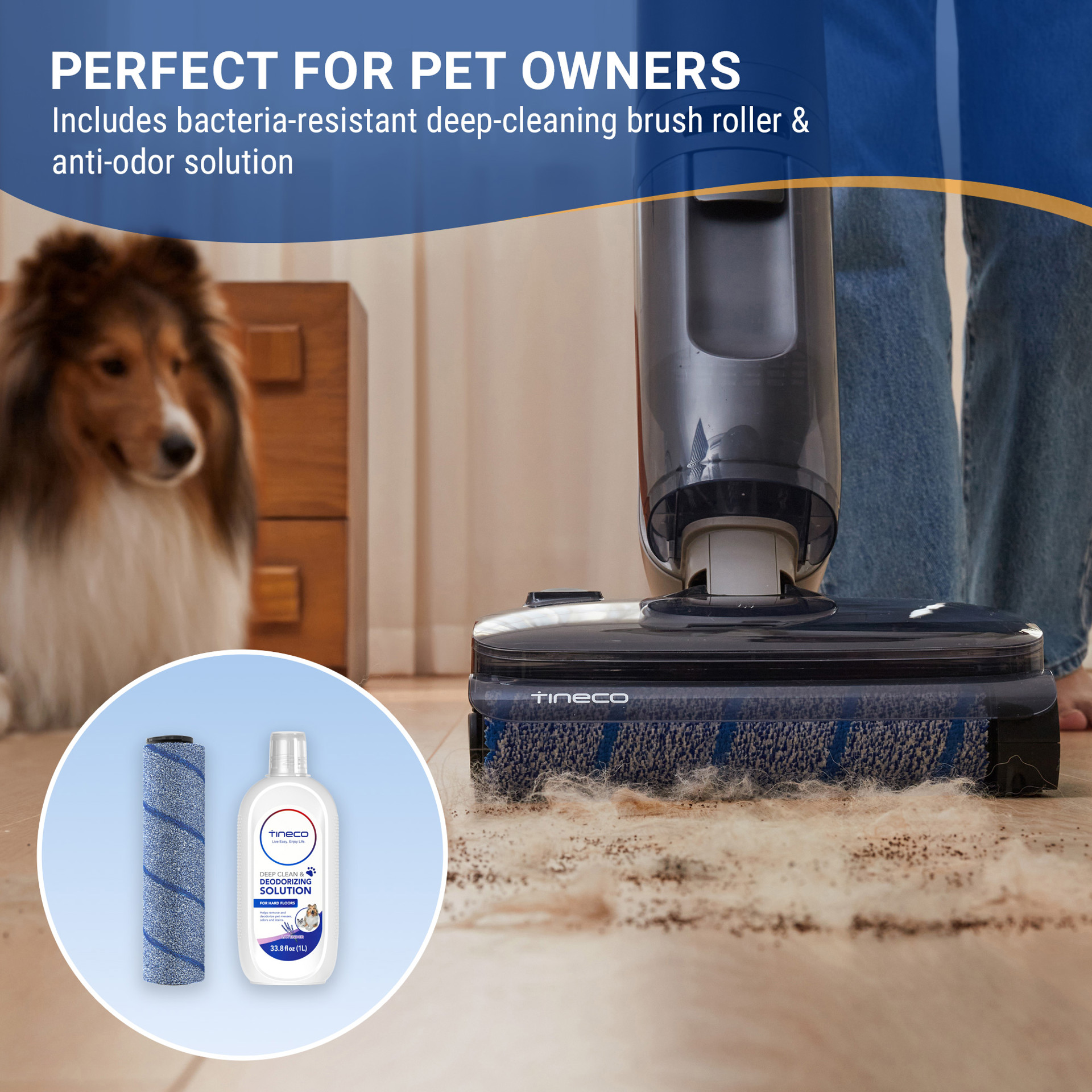 La brosse Zero Tangle s'occupe des poils d'animaux sans effort, tandis que la brosse de nettoyage en profondeur résistante aux bactéries et la solution anti-odeurs gardent votre maison fraîche.