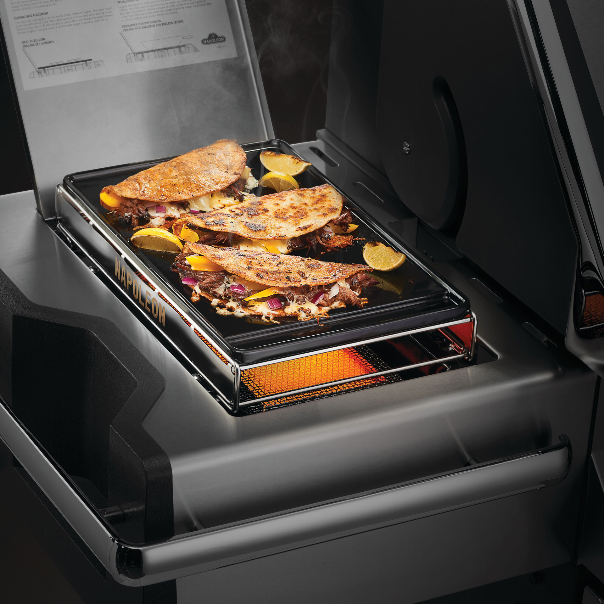 • Transformez votre brûleur Sizzle Zone en plaque de cuisson avec support en acier inoxydable pour une plus grande polyvalence culinaire