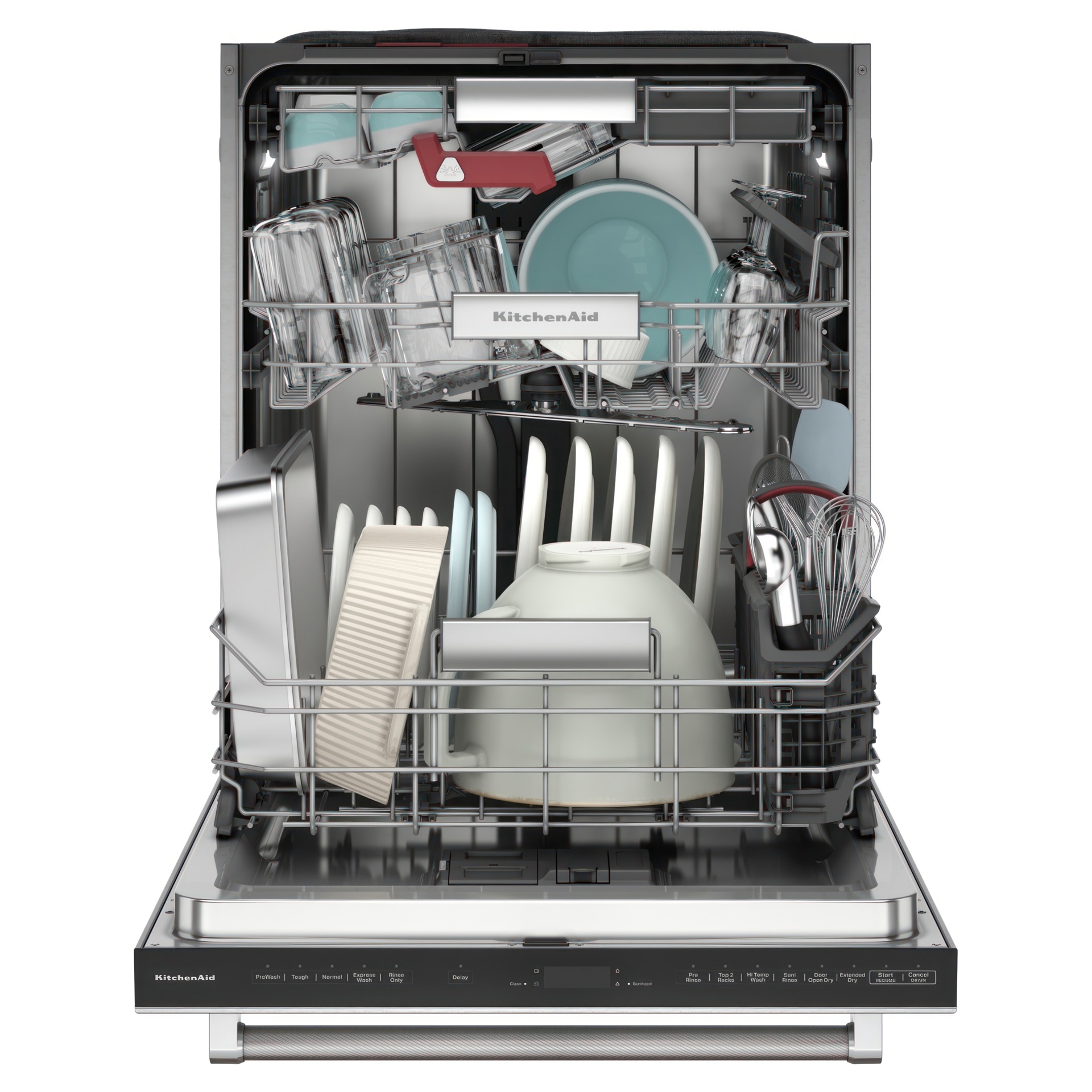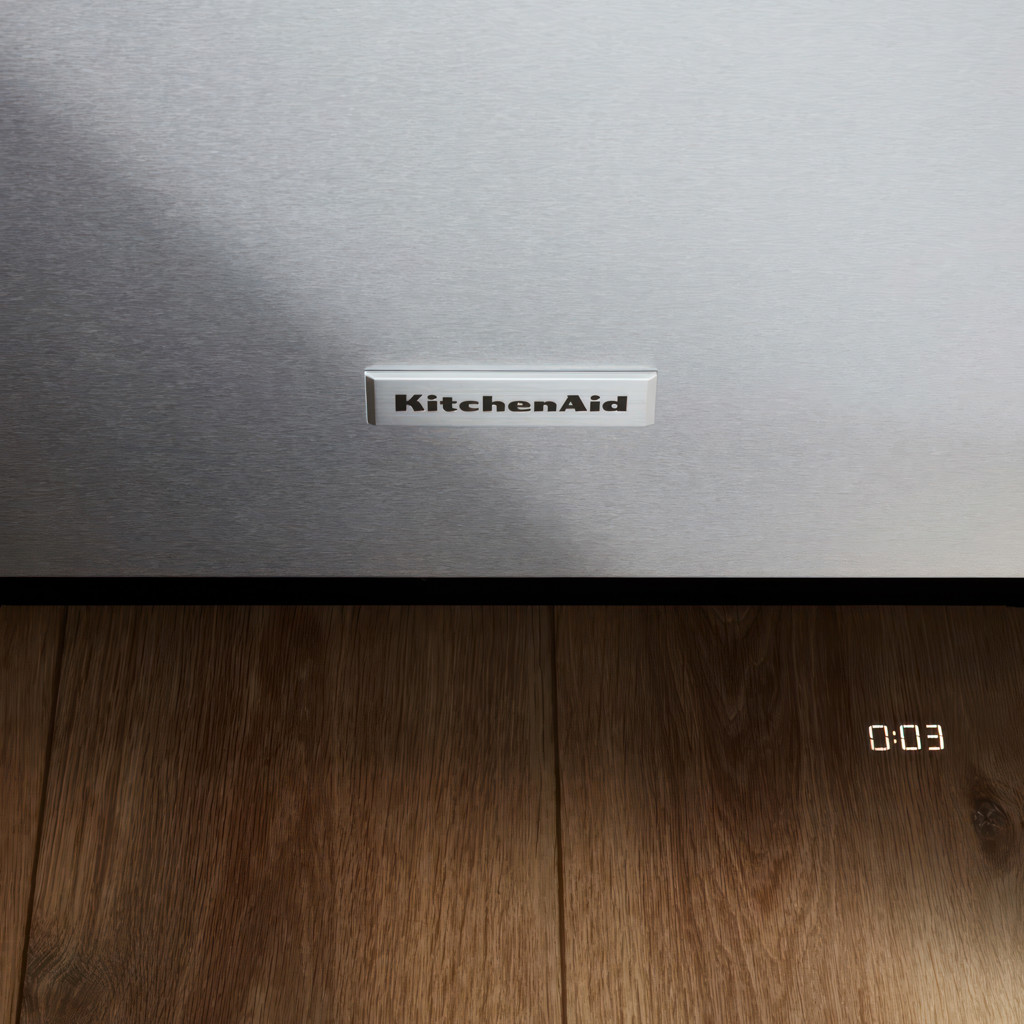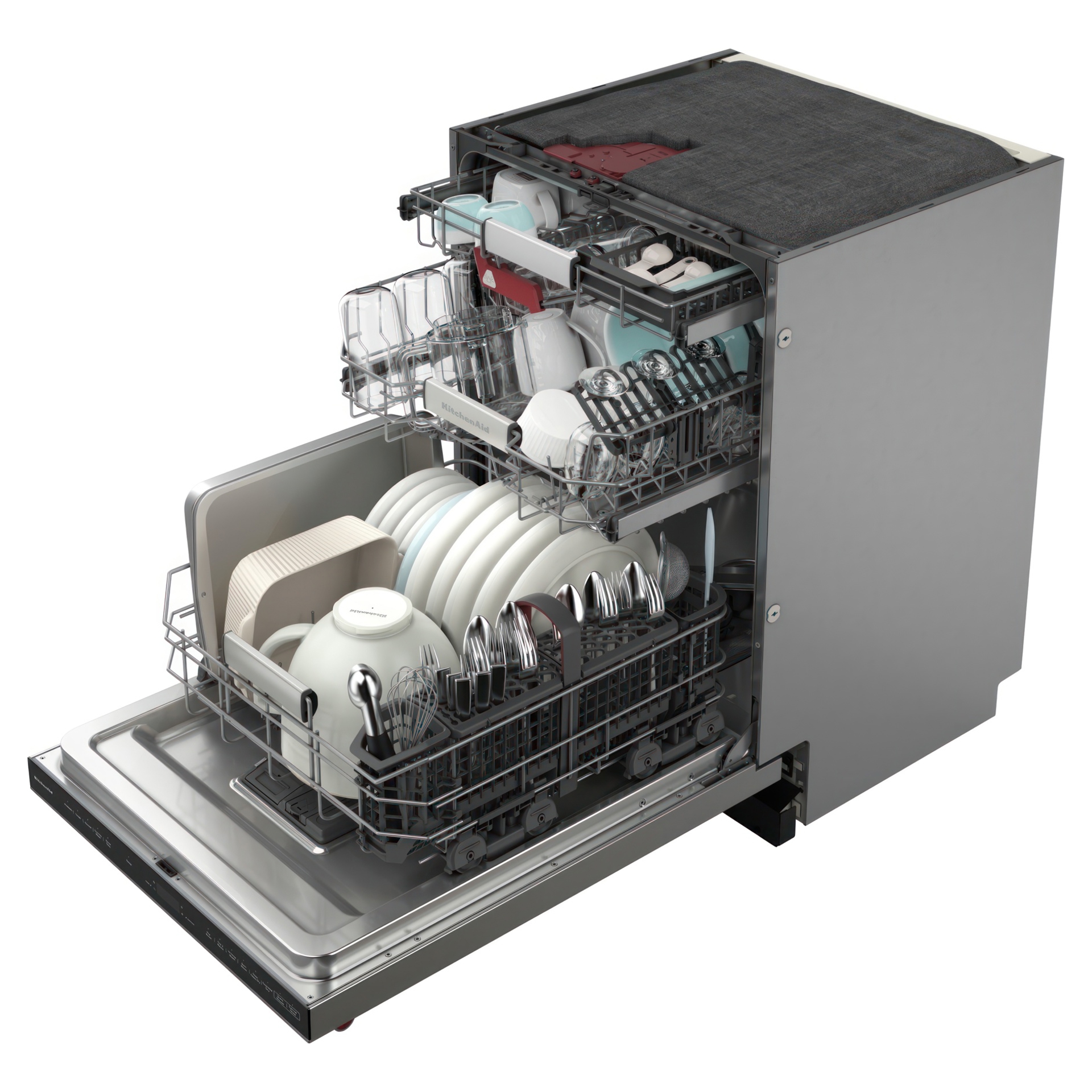 Ce lave-vaisselle à chasse d'eau KitchenAid® transforme le sale travail en quelque chose de beau. Le troisième panier FreeFlex™ Fit a une conception profonde et inclinée et, associé au panier central réglable, il offre une capacité 30 % supérieure à celle des lave-vaisselle à deux paniers KitchenAid®.