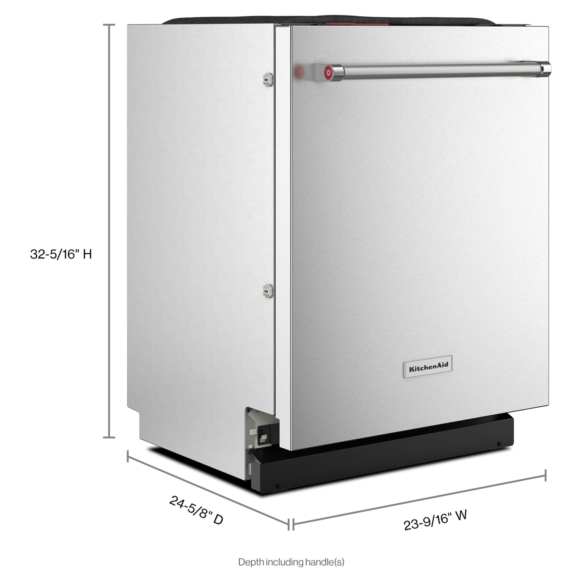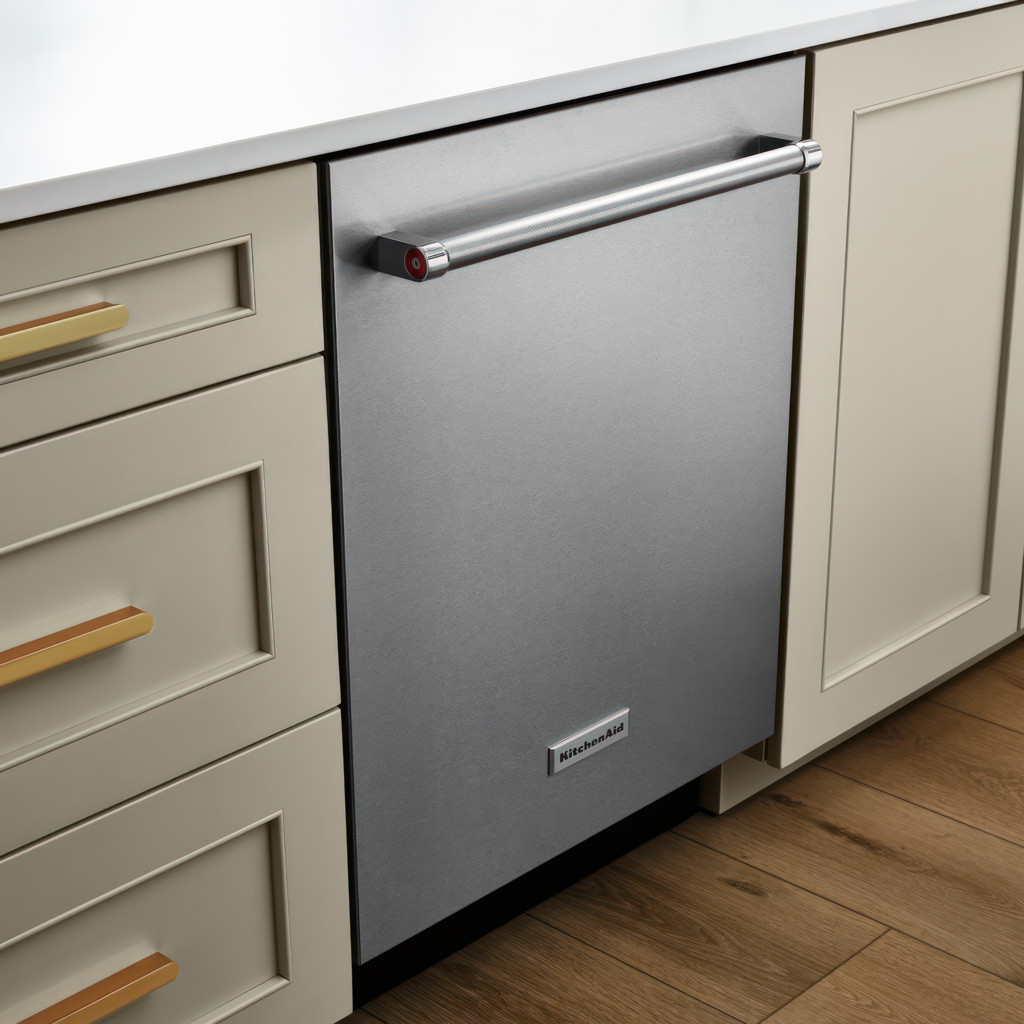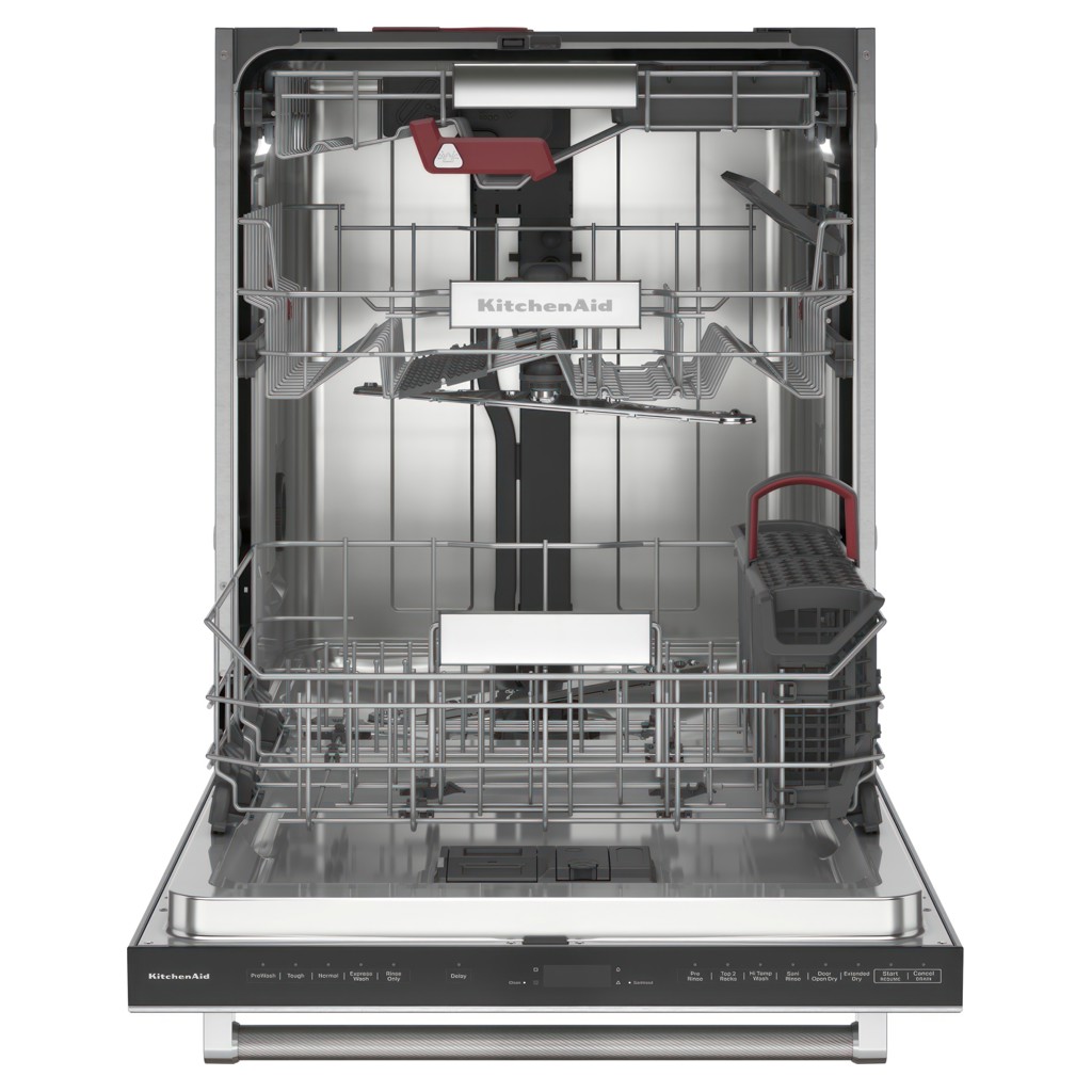 Ce lave-vaisselle à chasse d'eau KitchenAid® transforme le sale travail en quelque chose de beau. Le troisième panier FreeFlex™ Fit a une conception profonde et inclinée et, associé au panier central réglable, il offre une capacité 30 % supérieure à celle des lave-vaisselle à deux paniers KitchenAid®.