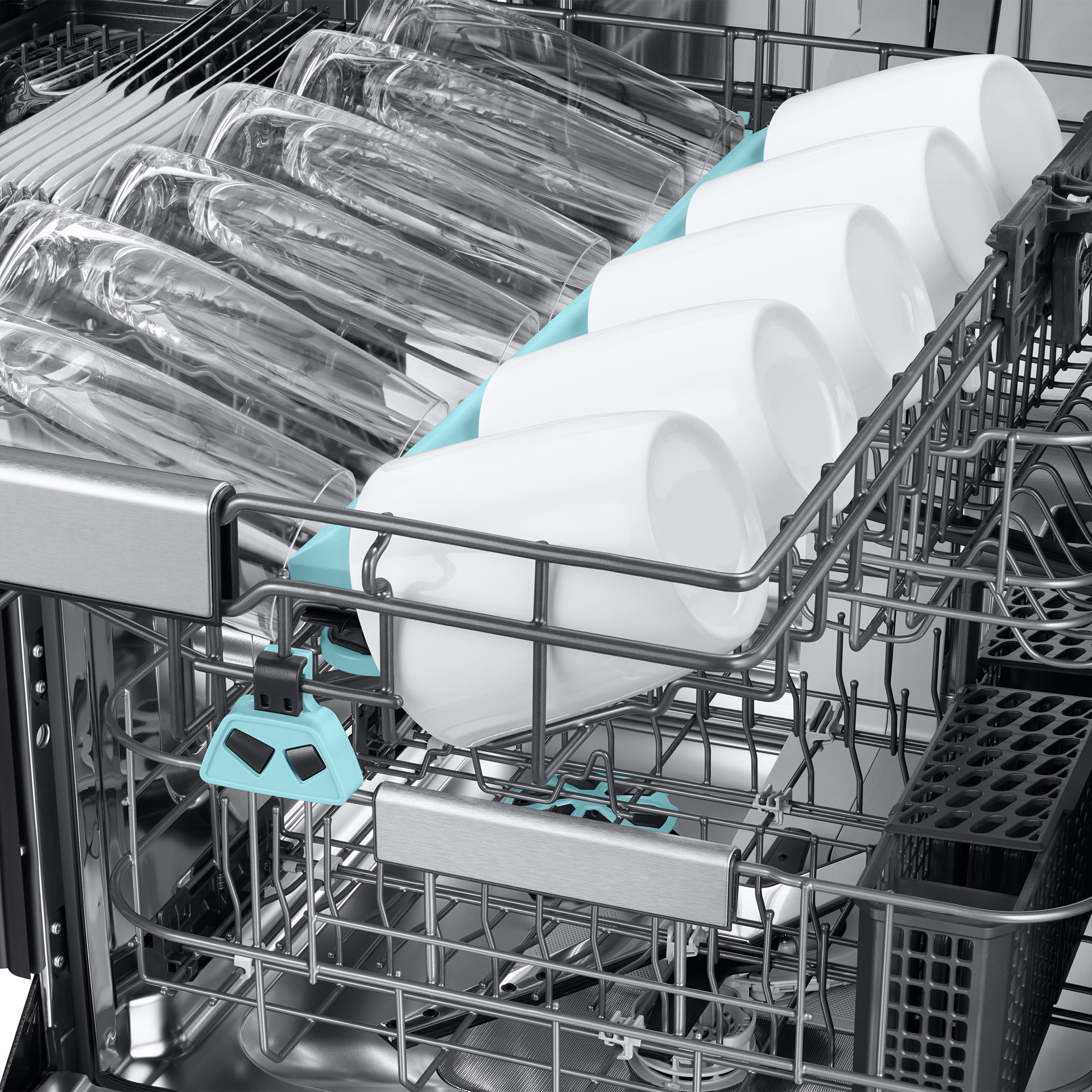 S'adapte facilemet à des plats de formes et de tailles variées. Vous pouvez régler la hauteur du panier central jusqu'à 6.3 cm et modifier l'angle des dents grâce à un levier. Les poêles peuvent être chargées verticalement dans le panier inférieur. Un support à verres avec embouts en silicone maintient les verres à vin délicats en toute sécurité