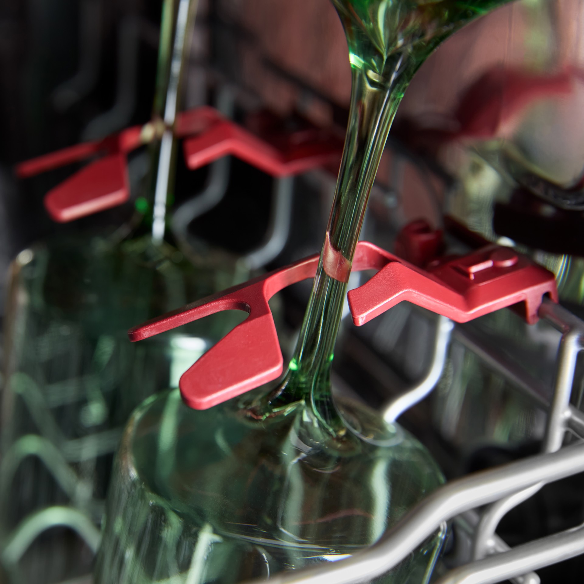 Deux porte-verres à pied fixent les verres à vin sur le côté du panier intermédiaire pour les empêcher de bouger pendant le cycle de lavage.