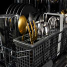 À l'intérieur, une puissance implacable assure une propreté impeccable à chaque assiette et chaque verre. À l'extérieur, la tranquillité règne, sublimée par des lignes épurées et un design haut de gamme. Un troisième panier à couverts avec revêtement plasma et une fonction d'ouverture automatique pour le séchage complètent ce modèle.