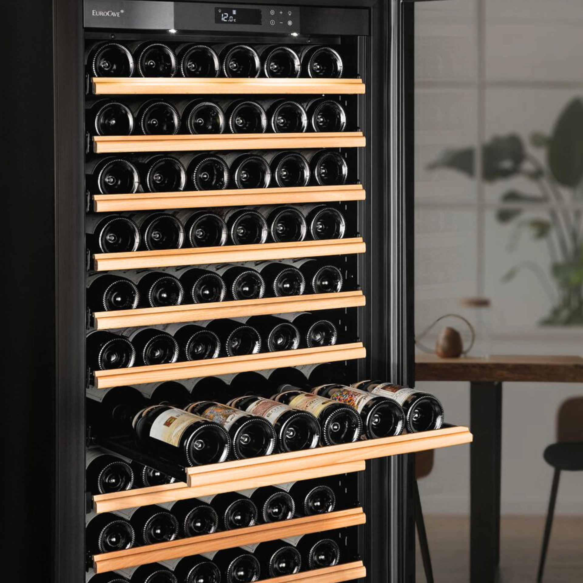 Équipé de 14 tablettes coulissantes "Main du Sommelier", il protège chaque bouteille des vibrations, tandis que la ventilation active empêche les moisissures. Sa porte pleine préserve le vin des effets néfastes de la lumière.