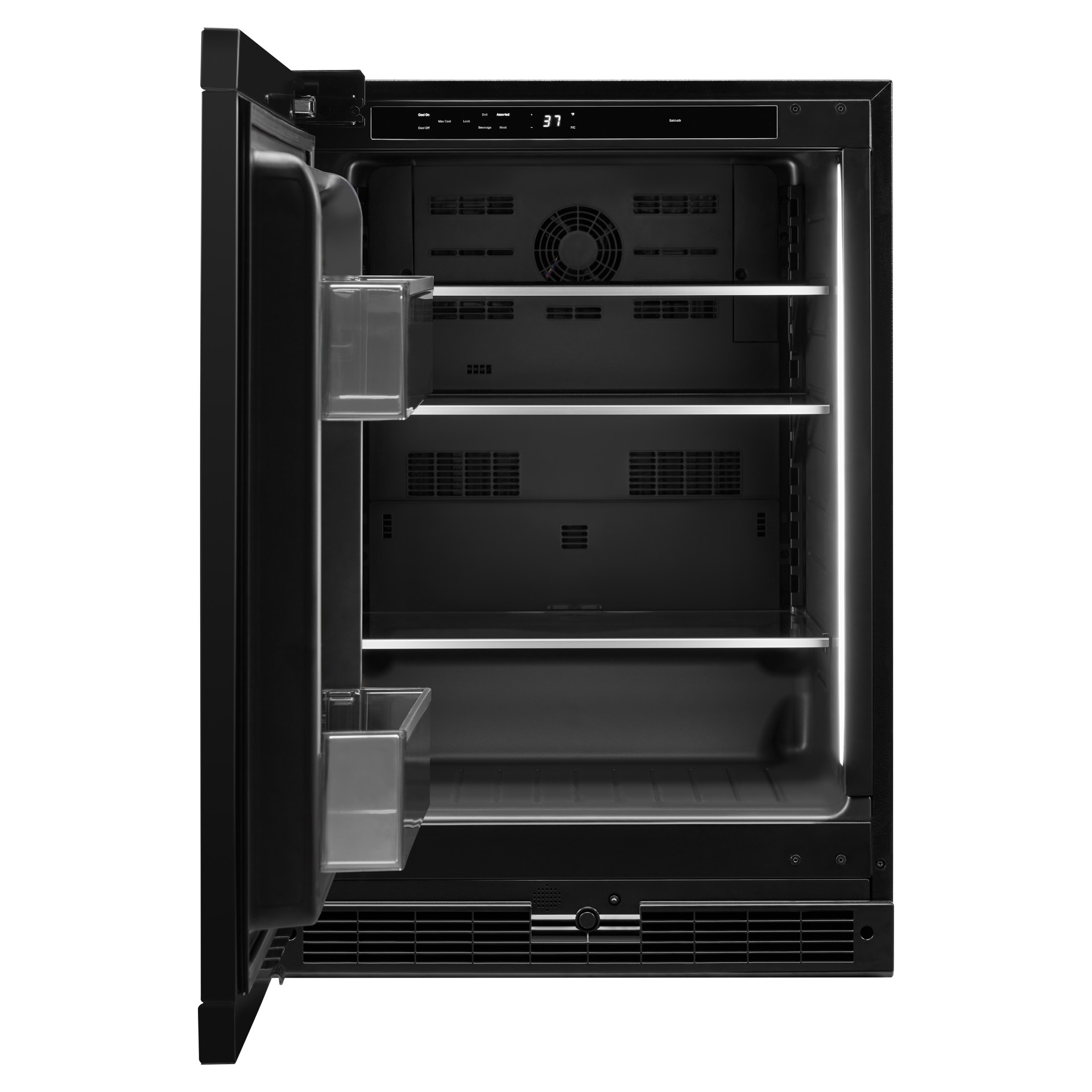 Faites place aux plaisirs coupables. Chaque délicieux morceau est caché derrière une porte en verre thermique, flottant presque sur du verre solide et inondé d'une douce lumière LED. Laissez les rafraîchissements, liquides ou autres, attendre dans un bonheur glacé.