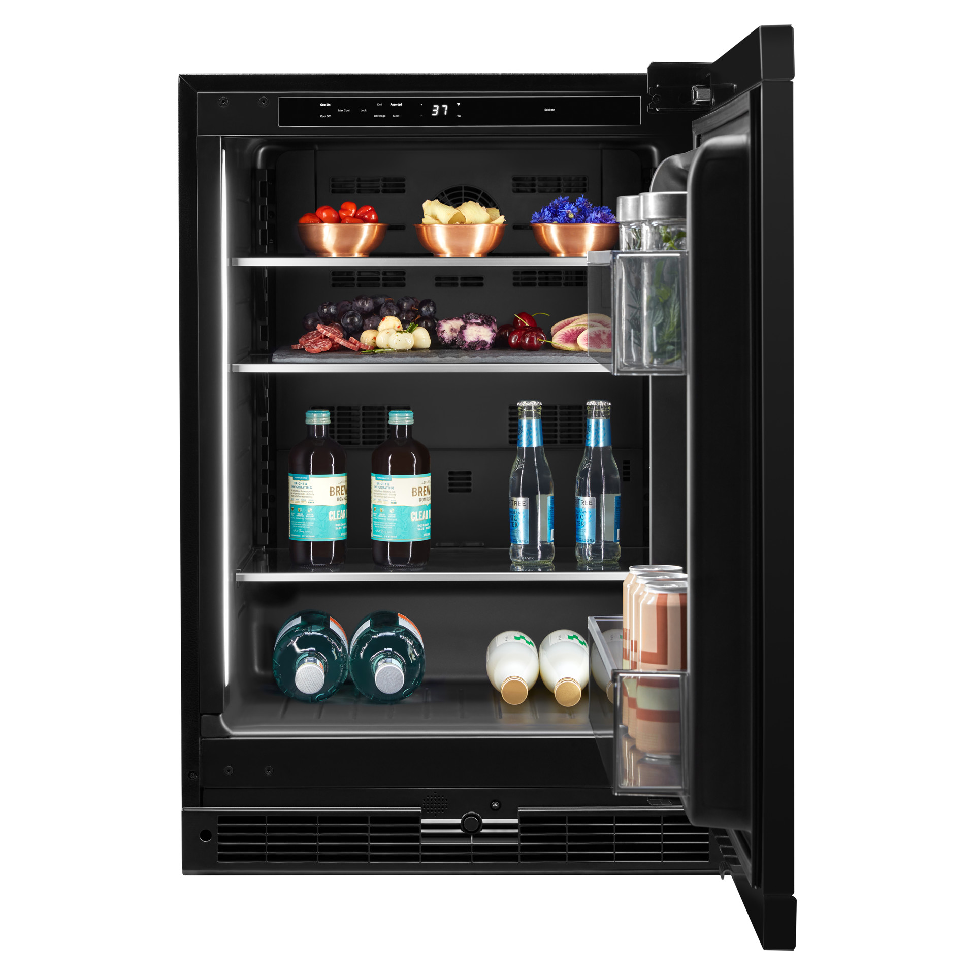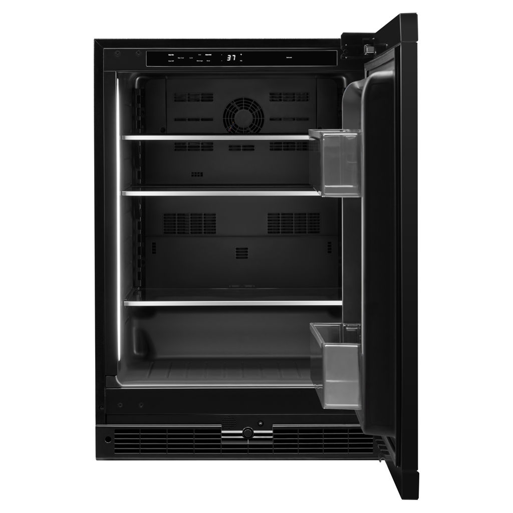 Faites place aux plaisirs coupables. Chaque délicieux morceau est caché derrière une porte en verre thermique, flottant presque sur du verre solide et inondé d'une douce lumière LED. Laissez les rafraîchissements, liquides ou autres, attendre dans un bonheur glacé.