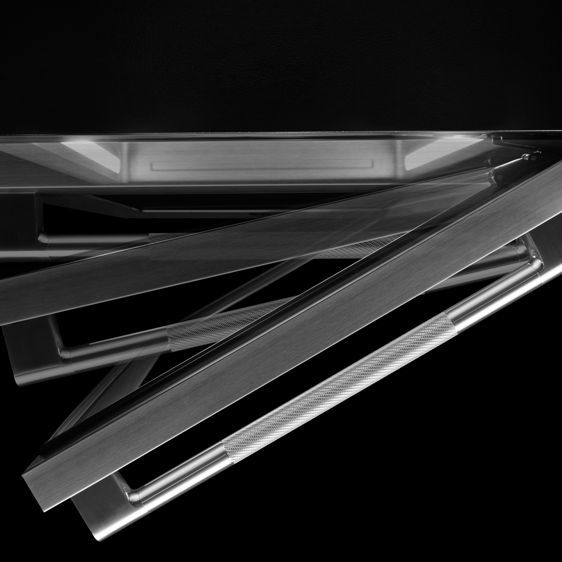 Admirez les plates-formes de verre enveloppées dans des cadres d'étagères inflexibles.