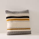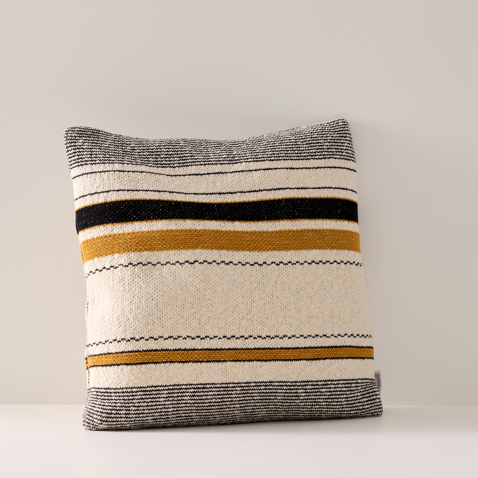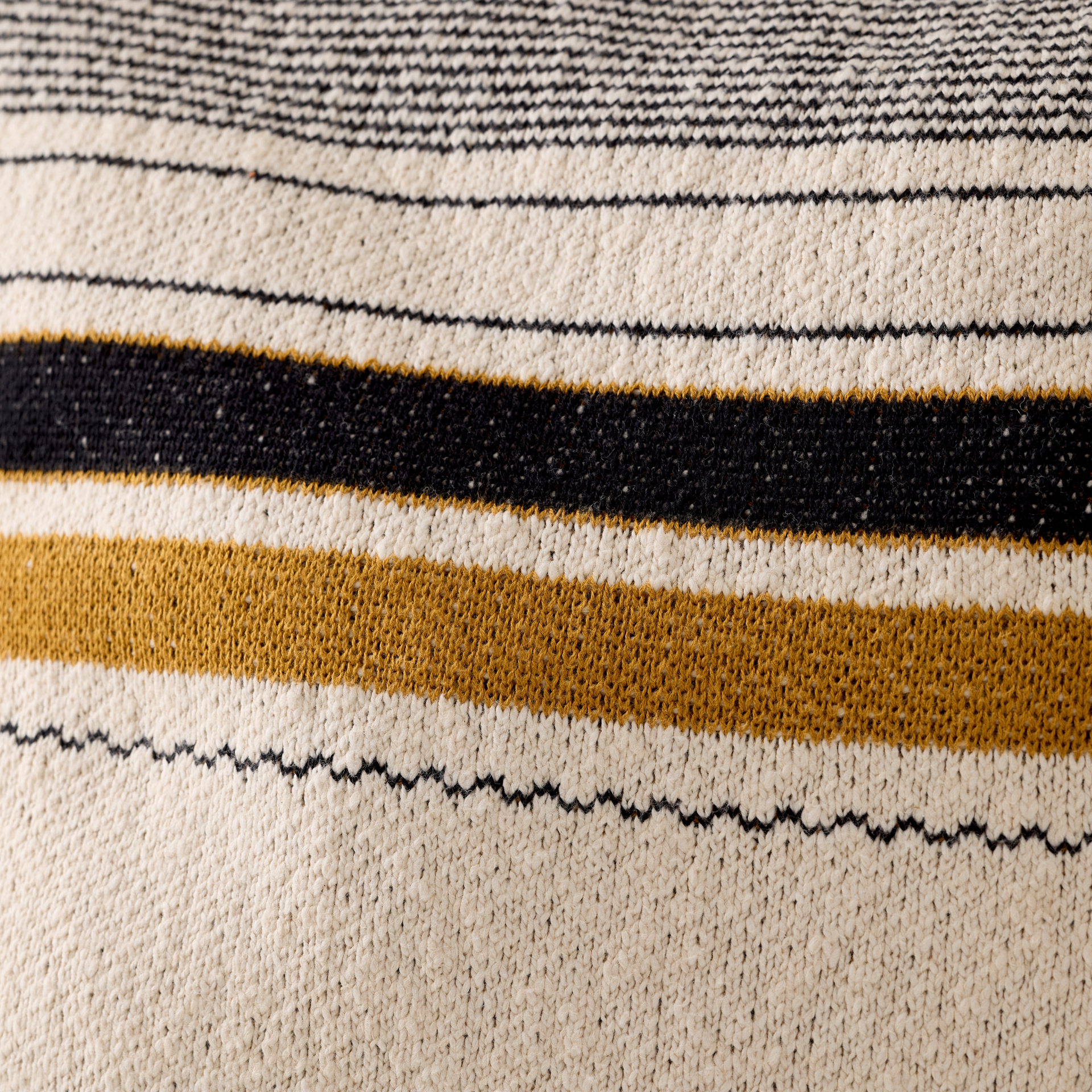 Coussin couleur naturelle avec rayures noires et moutardes. 100% coton. Bourre en polyester. Muni d'une fermeture éclair. Housse lavable à la machine.