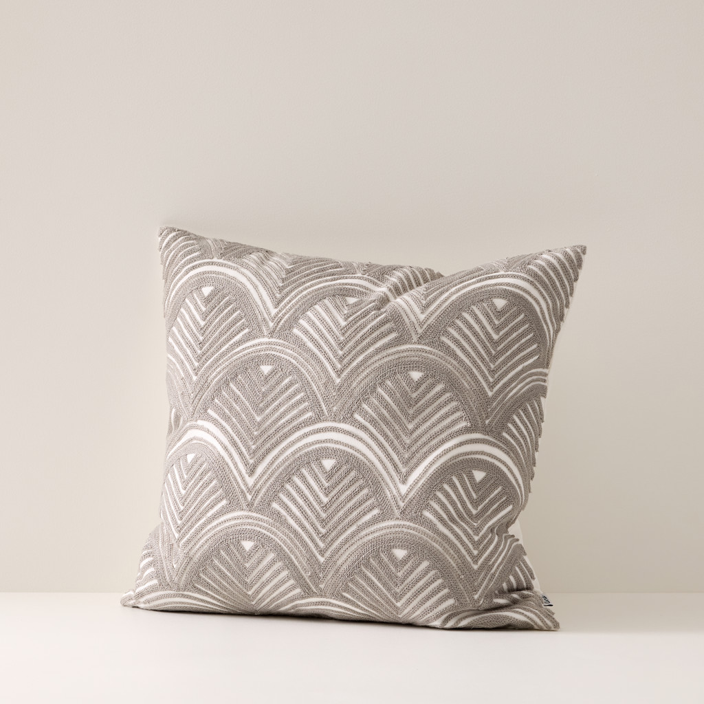 Magnifique coussin Nordic Grey 18" x 18" en tissu 100% coton avec une bourrure de plume. Fermeture éclair de couleur assortie, résistant et durable.