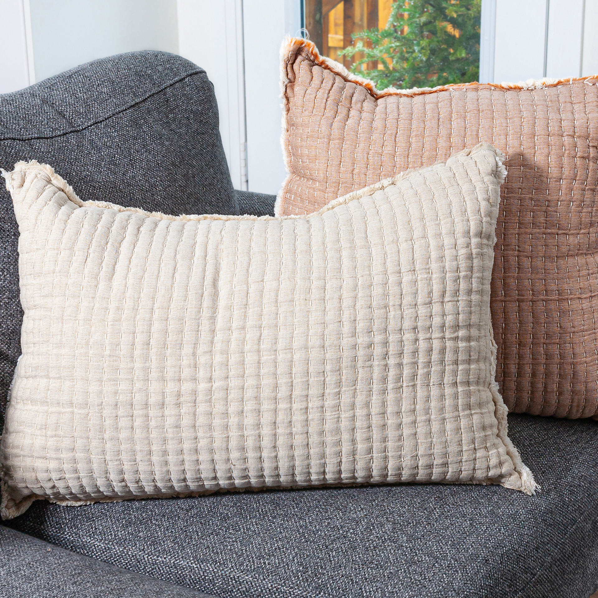 Notre oreiller rentangulaire Kantha est fabriqué à partir de deux couches de coton 100% doux, lavé à la pierre, entre lesquelles est intercalée une couche de fil de coton, le tout fini par des coutures. Cela confère à ces oreillers une sensation de confort et de chaleur.