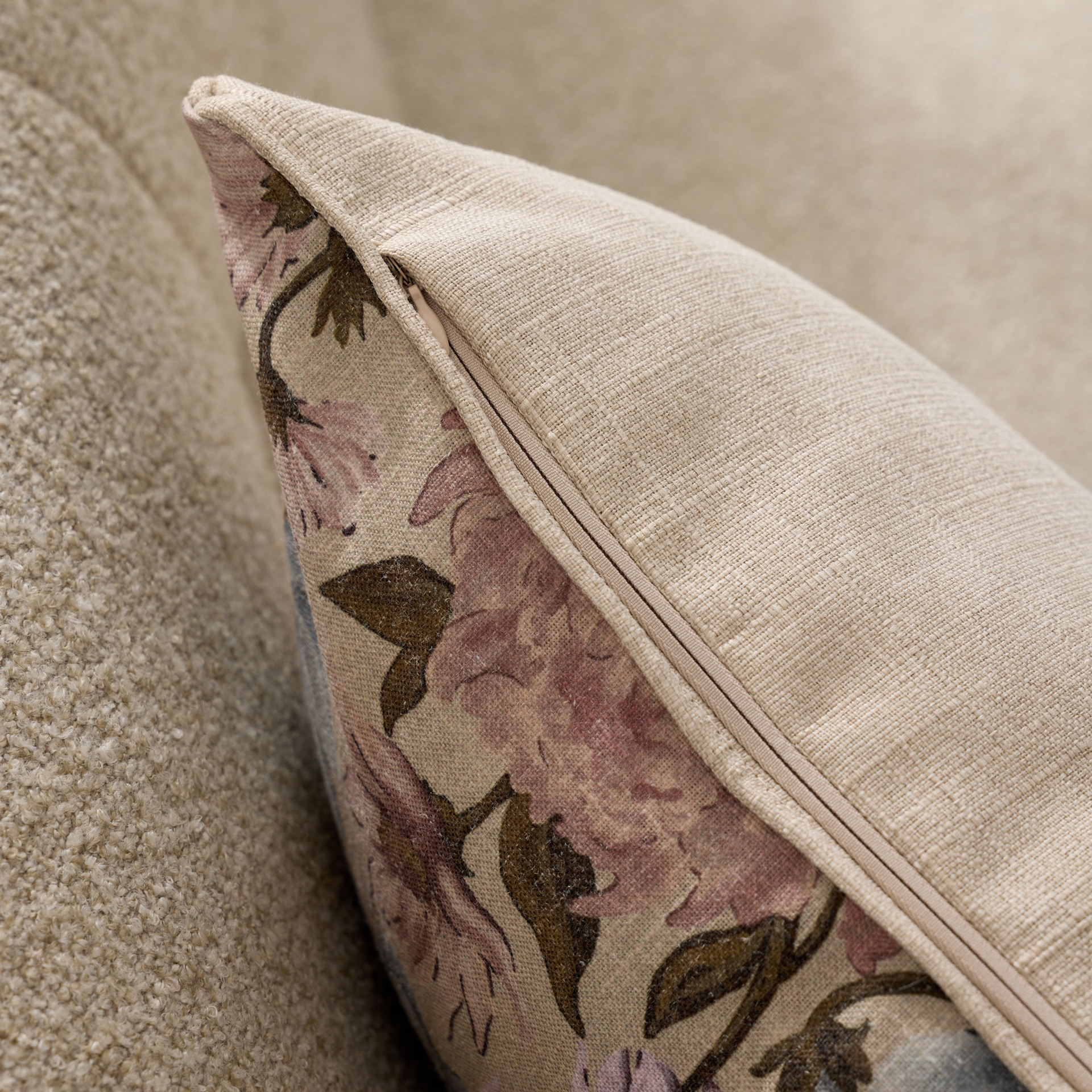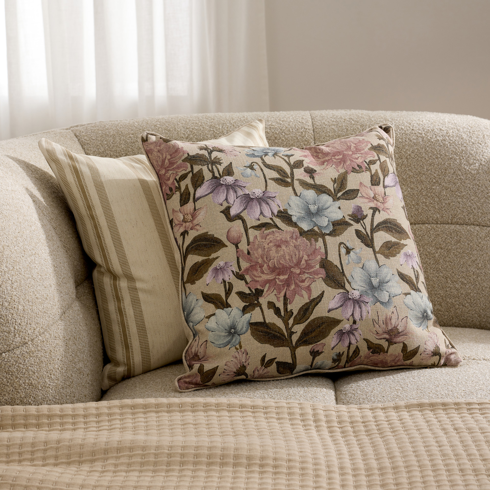 Apportez une touche de douceur et de charme intemporel à votre décor avec ce coussin au motif floral sur un fond beige lin.