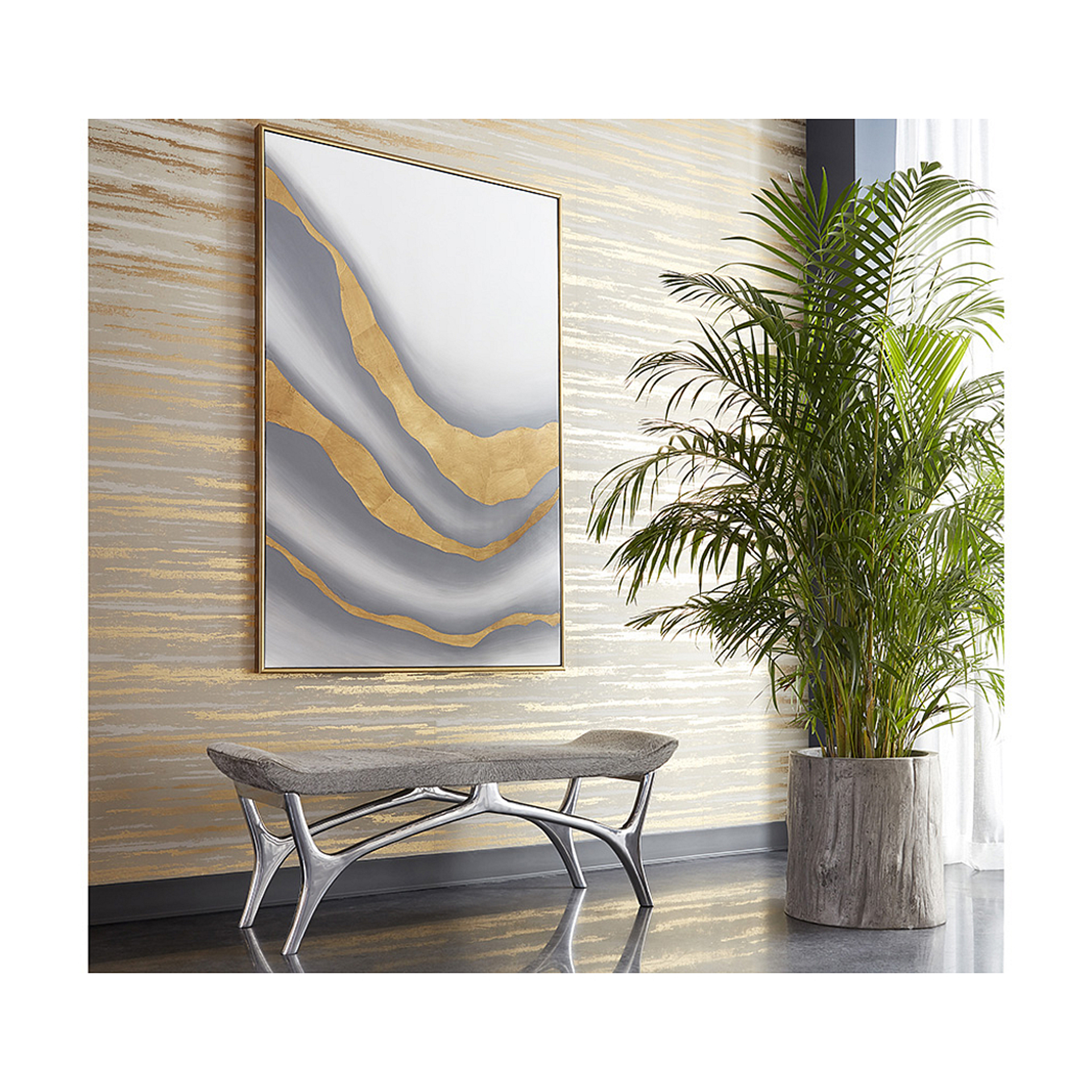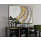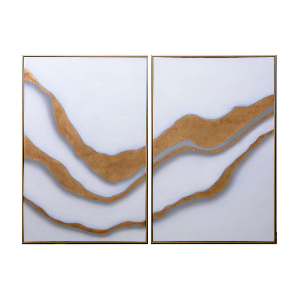 Ce diptyque exceptionnel évoque la beauté naturelle des paysages terrestres et aquatiques. Ses courbes dorées ondulantes traversent un fond blanc apaisant, créant un dialogue harmonieux entre les deux panneaux qui se complètent à merveille.